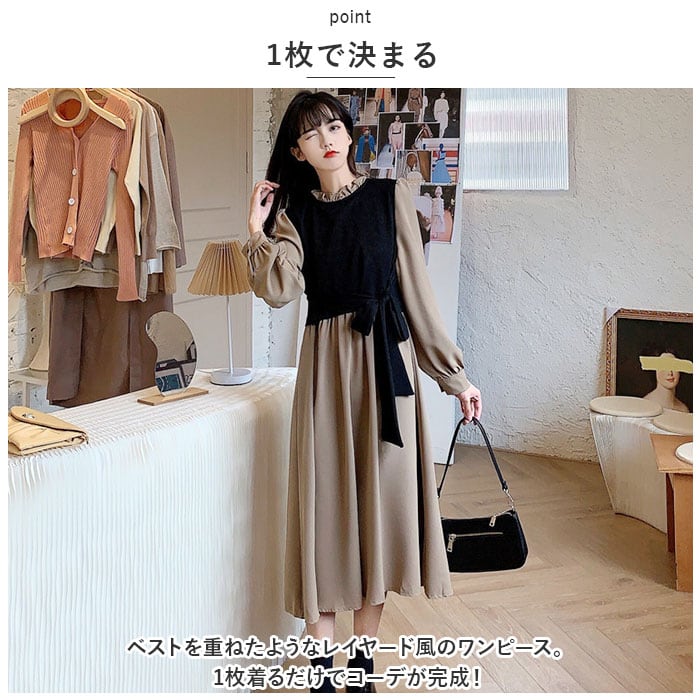 ・ショート丈のベストを重ねたようなレイヤード風のワンピース。1枚着るだけでコーデが完成!