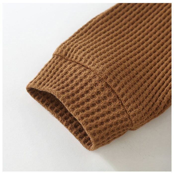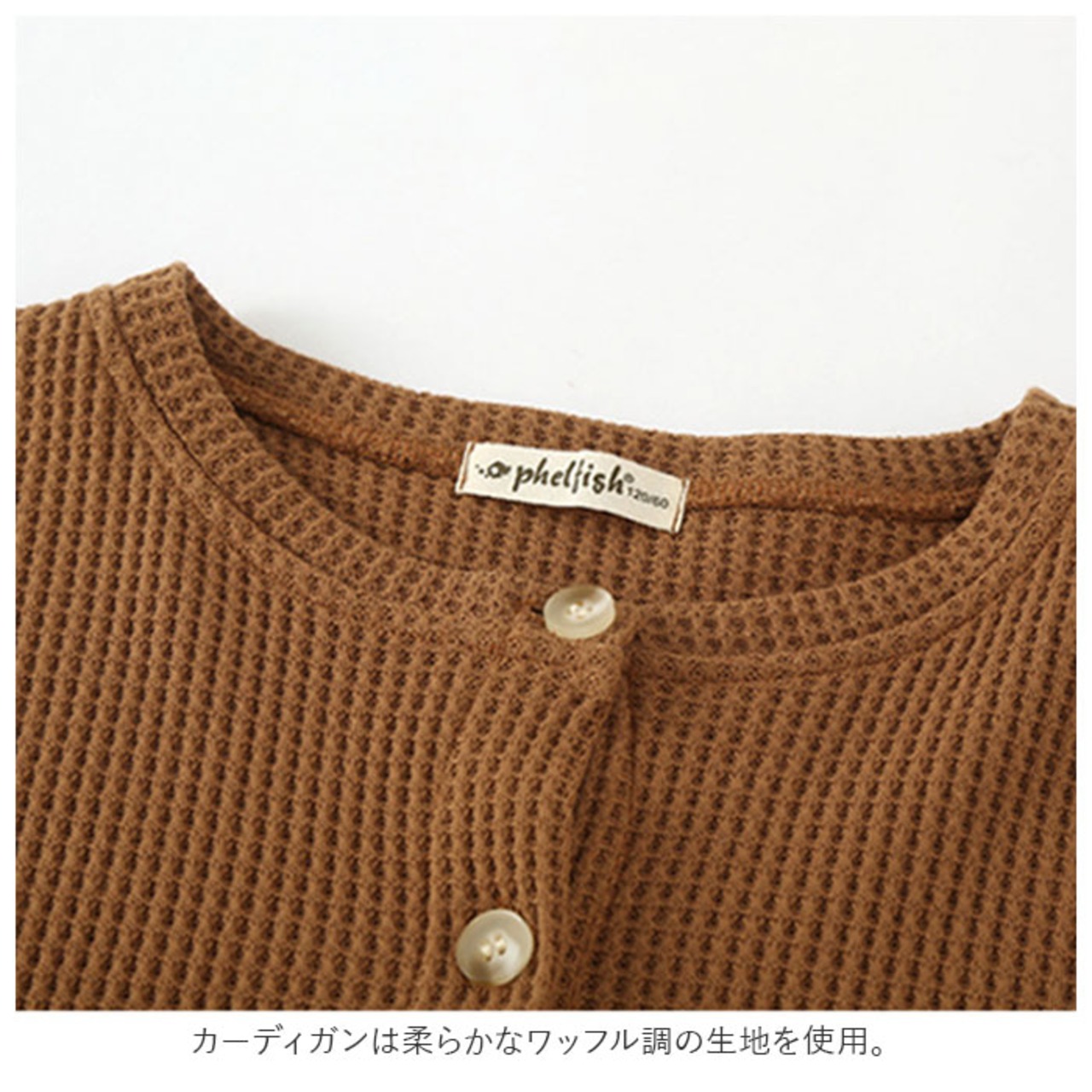 ・カーディガンは柔らかなワッフル調の生地を使用。