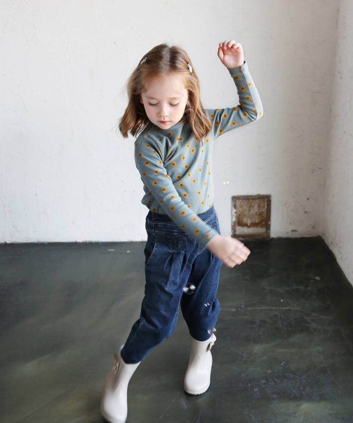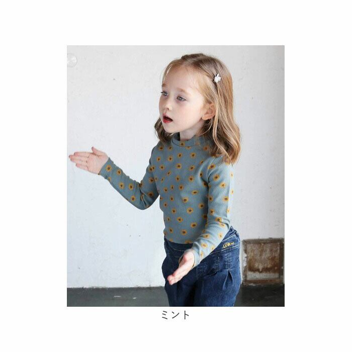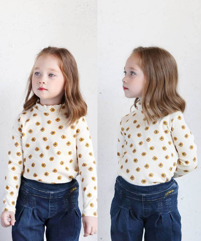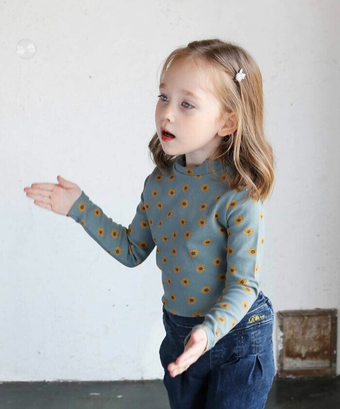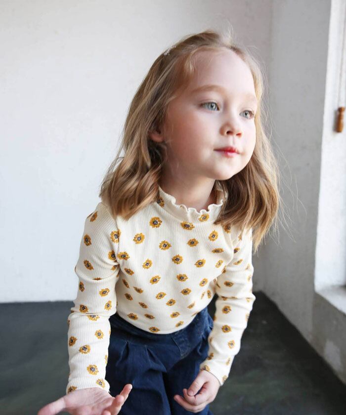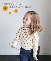 ・秋冬春3シーズン着まわせる、リブ編みコットン生地で編まれた女の子のトップスをお届けします♪ひまわりの笑顔のようなお花プリントTシャツは、首元メロウが、可愛さ際立つデザインがママにも女の子にも好感度◎