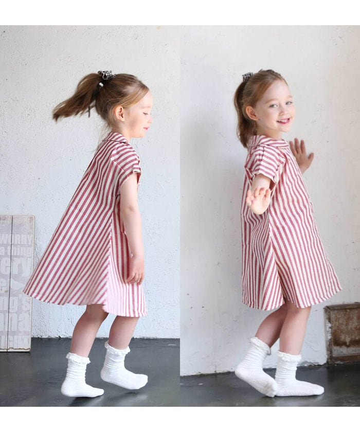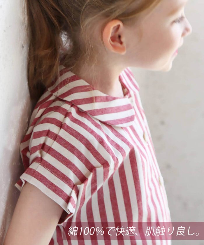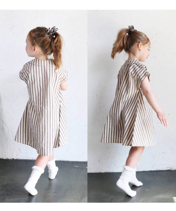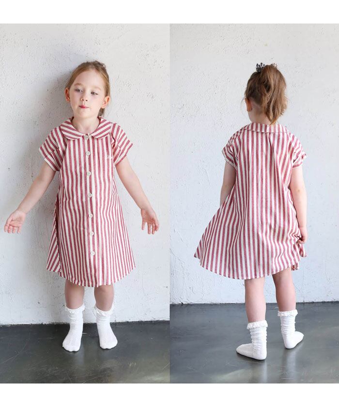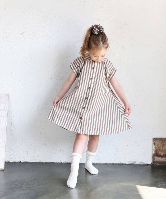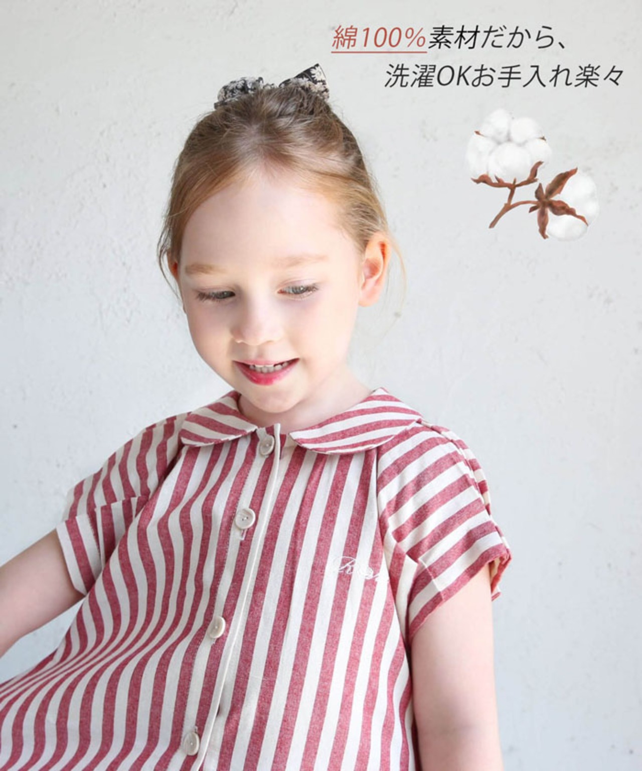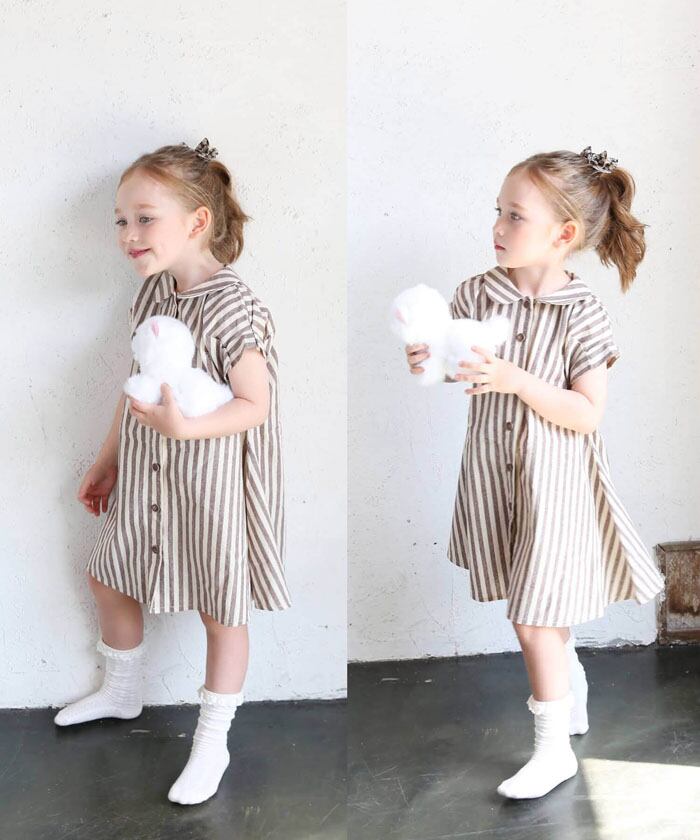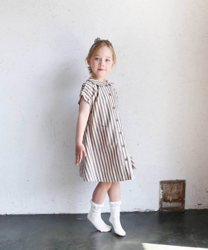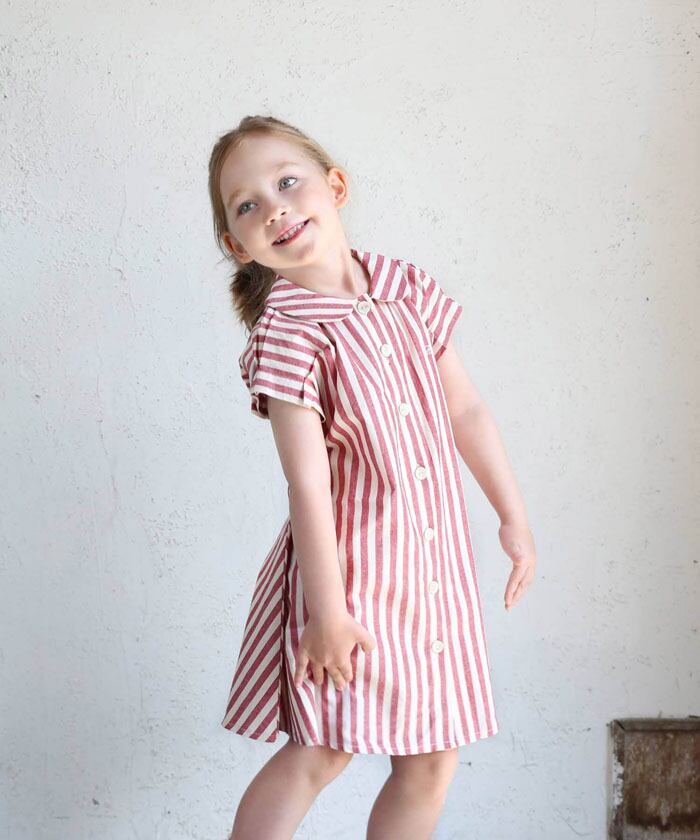 ・フロントのボタンは ヴィンテージの魅力を放ち、一つ一つ留めるごとに 新たな物語が始まる予感!子供の夏の日常に寄り添うワンピースです♪綿100%の素材で、洗濯機でざっと洗い上げてもその風合いを保ちます。