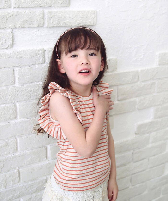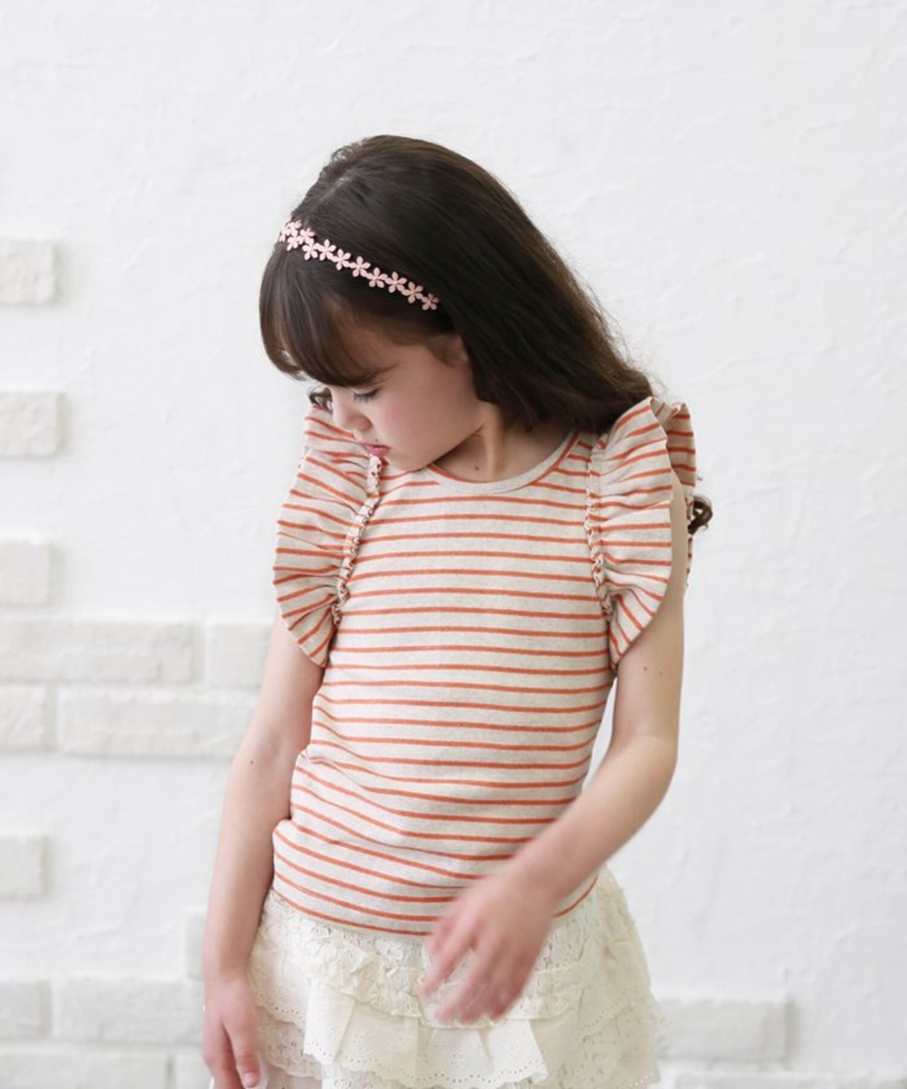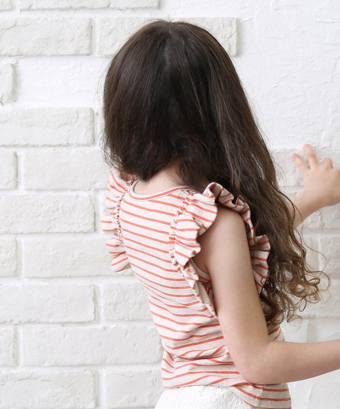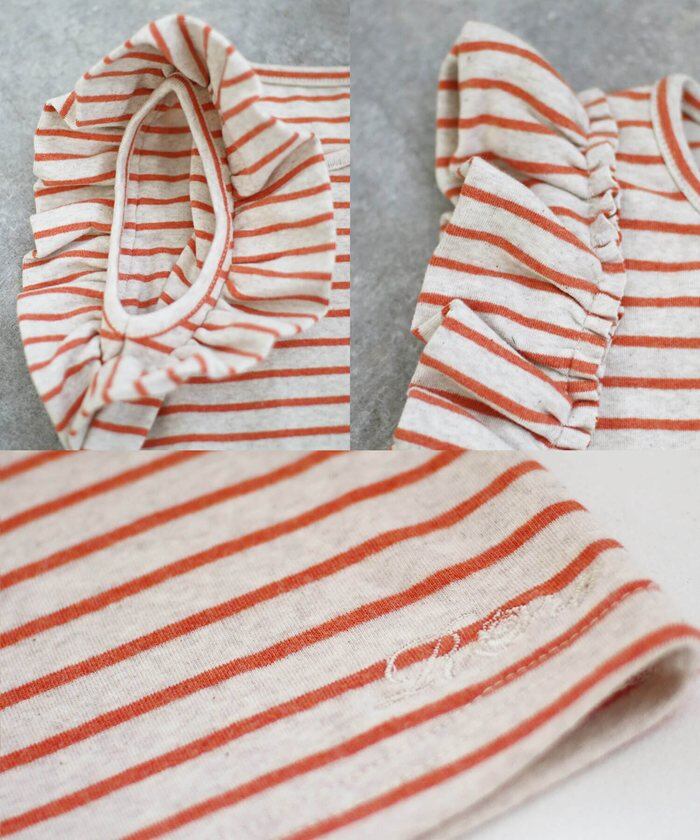 ・肩のフリルが、まるで小さな蝶々が羽ばたくように とってもラブリー!ビンテージオレンジのストライプは ちょっぴり大人っぽくて、レトロで可愛い!コットン100%の素材で 肌に優しいのも嬉しいポイントです。