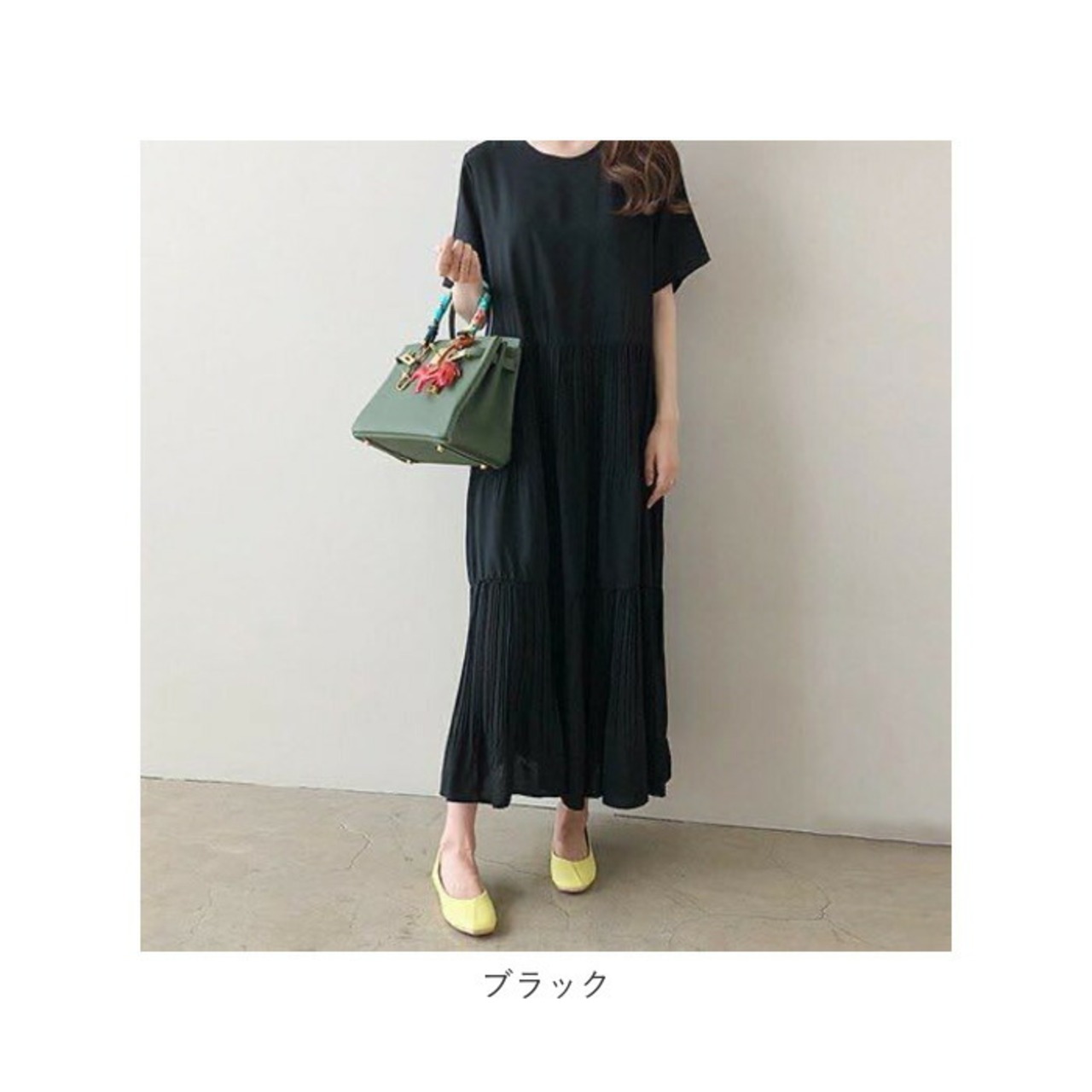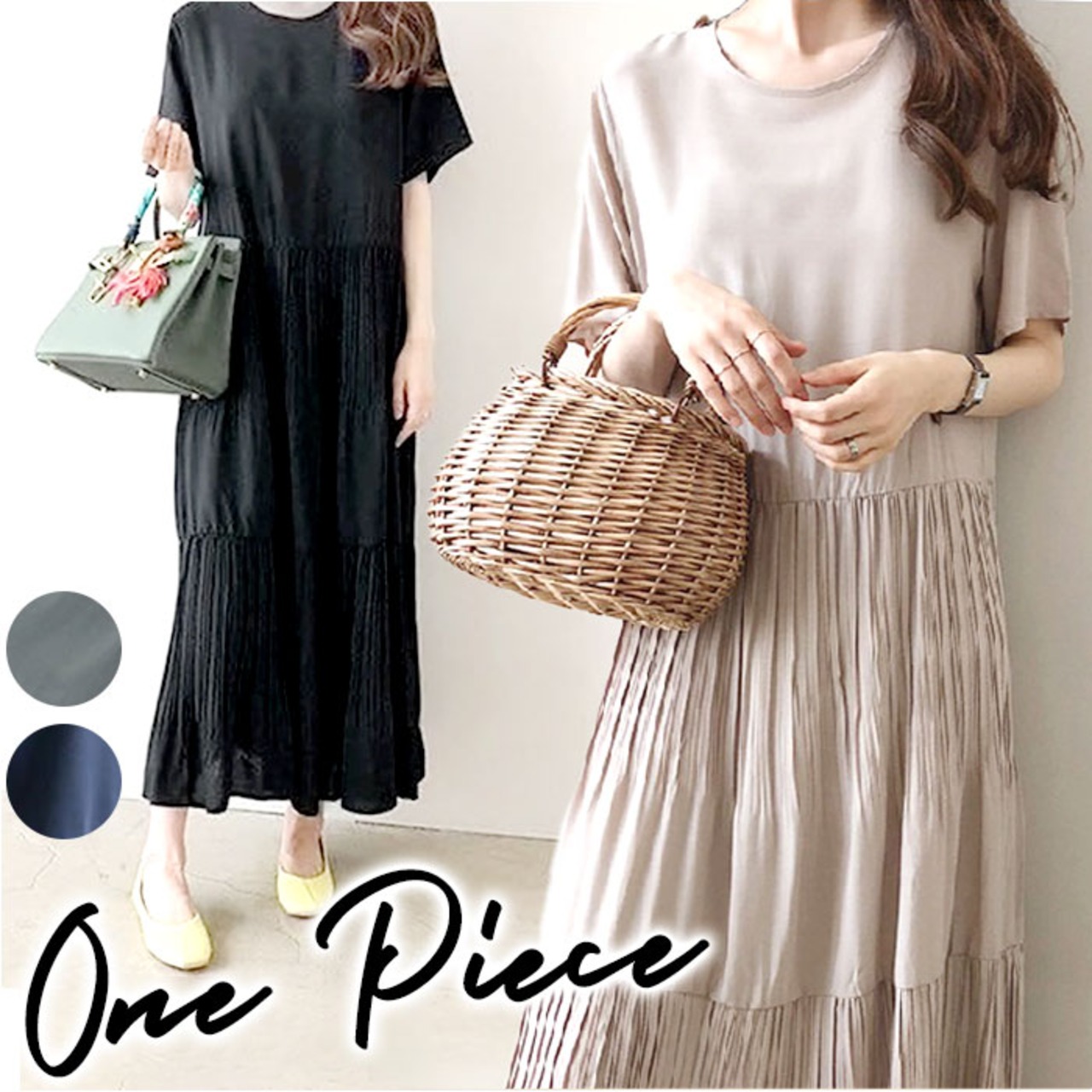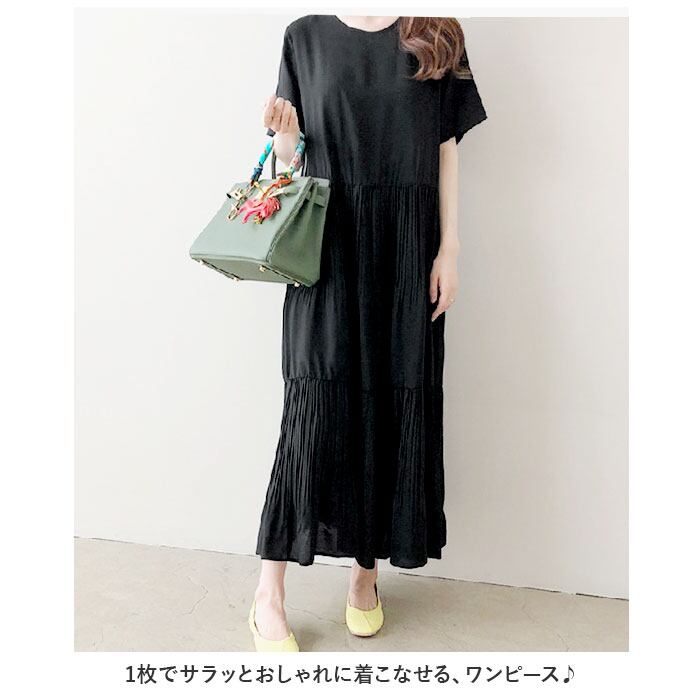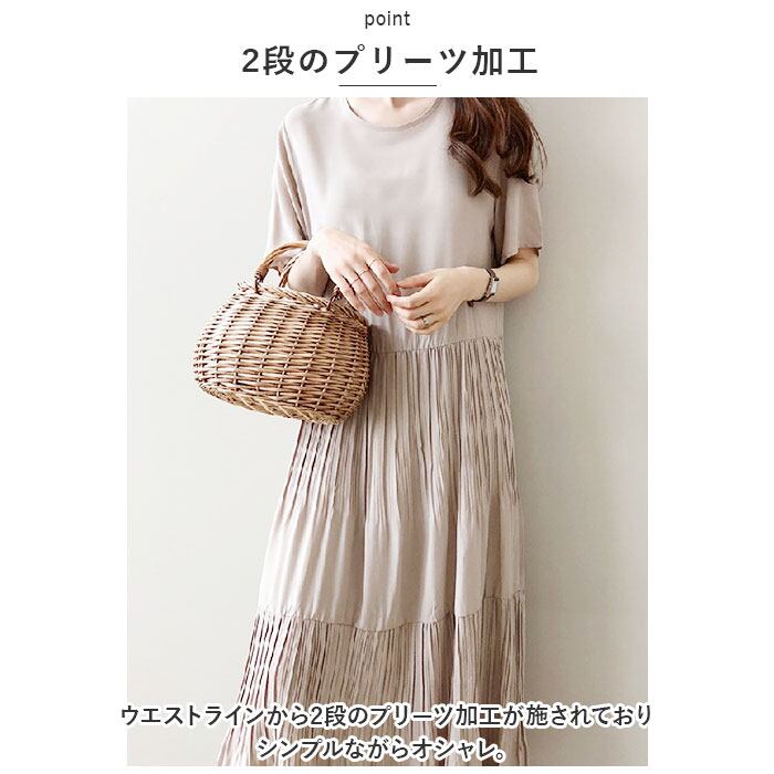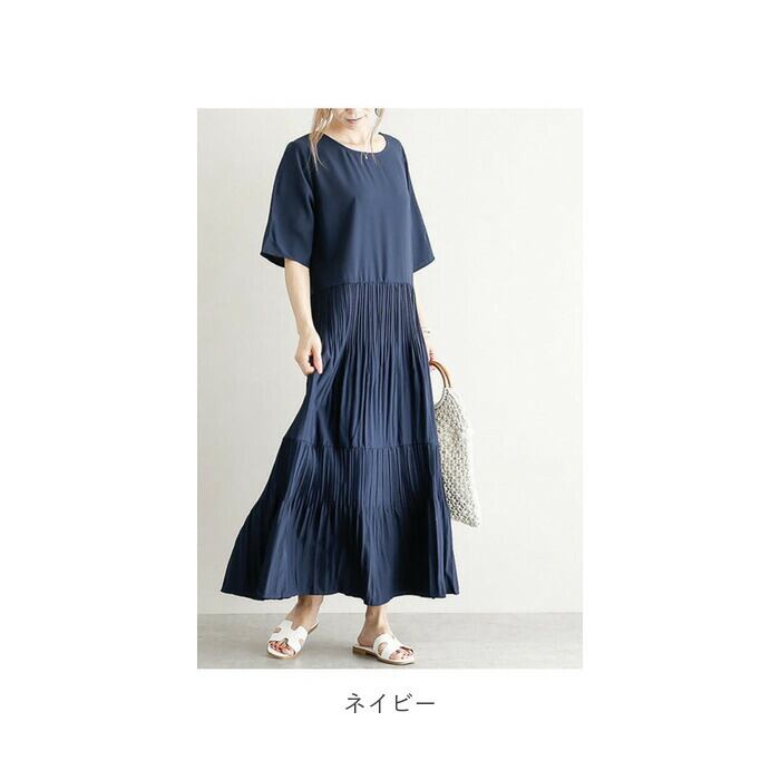 ワンピース 半袖 レディース 通販 プリーツ ワンピ ロング ラウンドネック ロング丈 デザイン ゆったり 体型カバー ポリエステル シンプル カジュアル 通学 通勤 かわいい おしゃれ