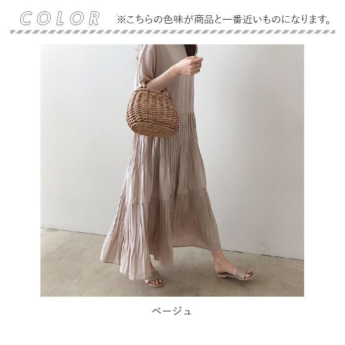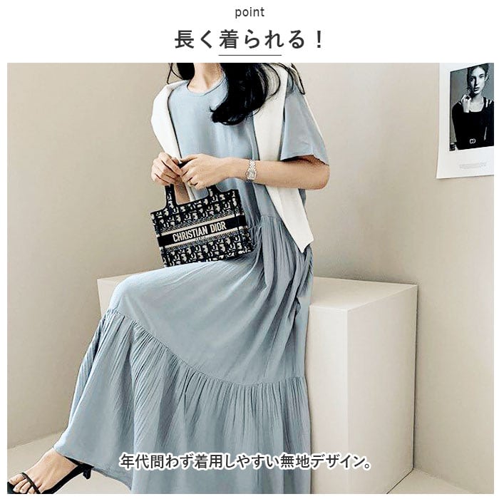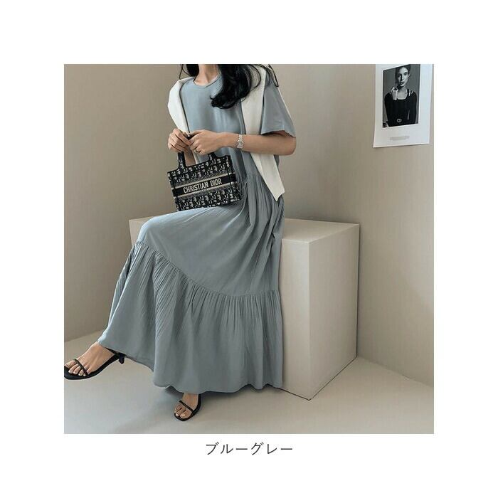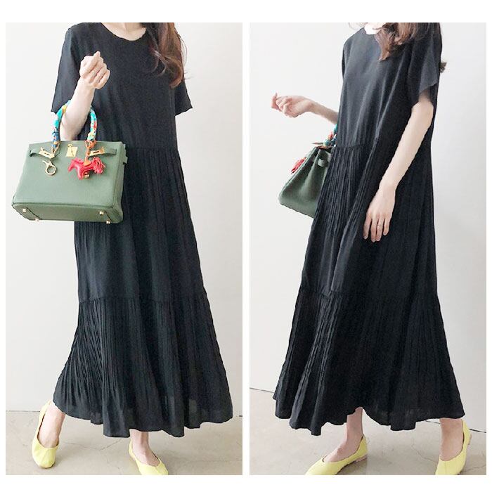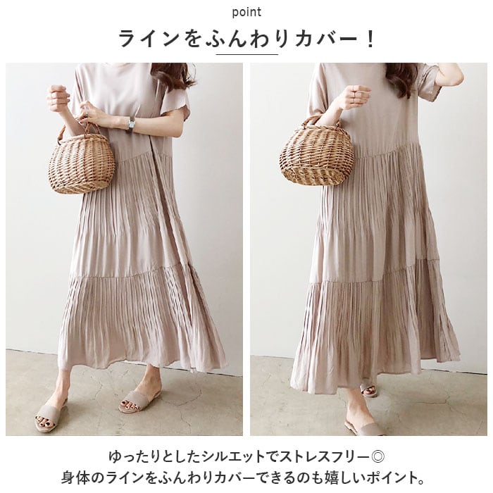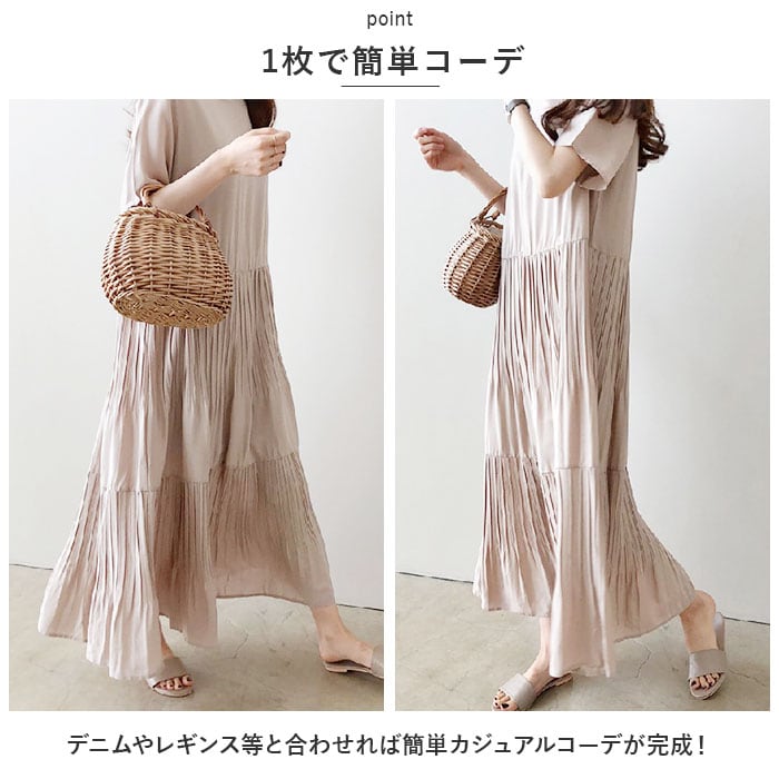 ワンピース 半袖 レディース 通販 プリーツ ワンピ ロング ラウンドネック ロング丈 デザイン ゆったり 体型カバー ポリエステル シンプル カジュアル 通学 通勤 かわいい おしゃれ
