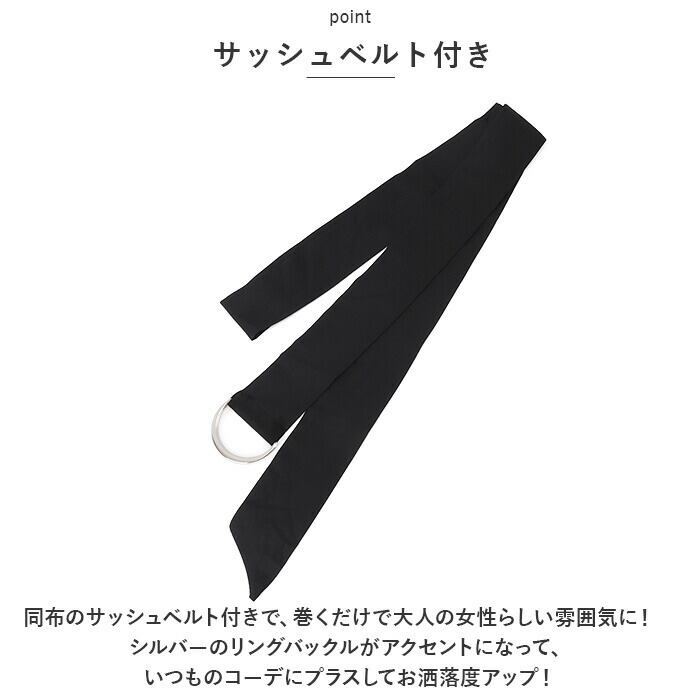 ・同布のサッシュベルト付きで、巻くだけで大人の女性らしい雰囲気に! シルバーのリングバックルがアクセントになって、いつものコーデにプラスしてお洒落度アップ!