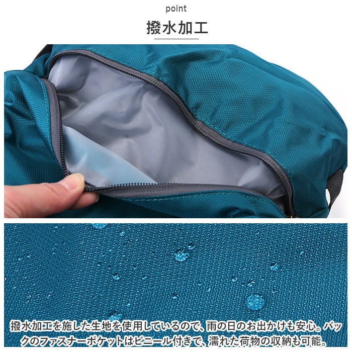 ・撥水加工を施した生地を使用しているので、雨の日のお出かけも安心。バックのファスナーポケットはビニール付きで、濡れた荷物の収納も可能。