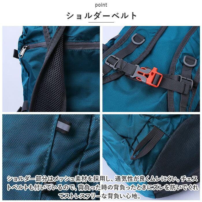 ・ショルダー部分はメッシュ素材を採用し、通気性が良くムレにくい。チェストベルトも付いているので、背負った時の背負ったときにズレを防いでくれてストレスフリーな背負い心地。