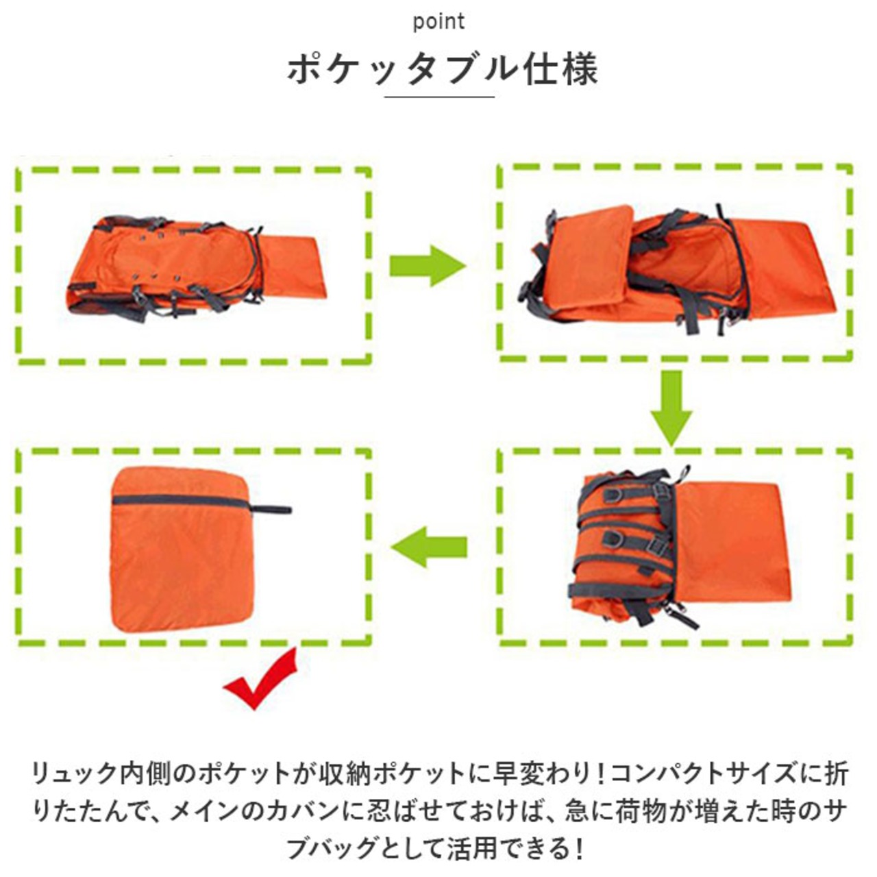 ・リュック内側のポケットが収納ポケットに早変わり!コンパクトサイズに折りたたんで、メインのカバンに忍ばせておけば、急に荷物が増えた時のサブバッグとして活用できる!