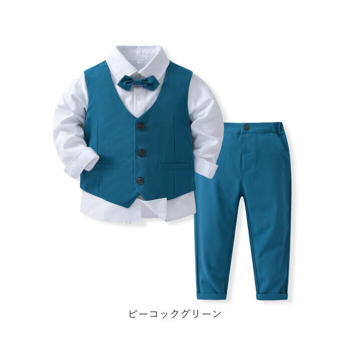 ・ベスト、長袖シャツ、ロングパンツ、蝶ネクタイの4点セット。大人顔負けのかっこいいスタイリングが完成☆