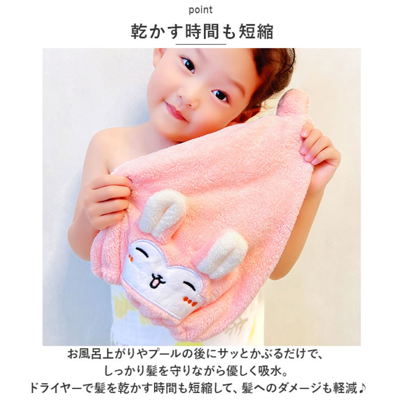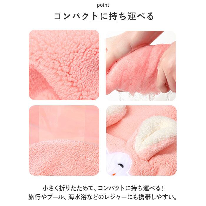 ・お風呂上がりやプールの後にサッとかぶるだけで、しっかり髪を守りながら優しく吸水。ドライヤーで髪を乾かす時間も短縮して、髪へのダメージも軽減♪