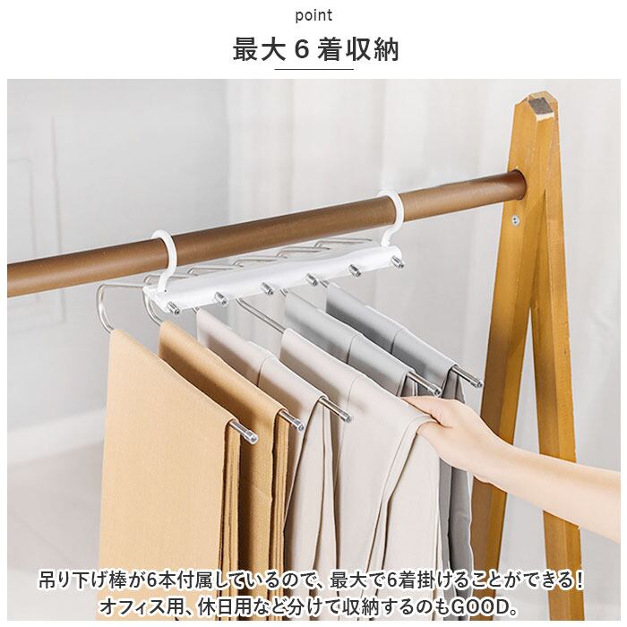 ・吊り下げ棒が6本付属しているので、最大で6着掛けることができる!オフィス用、休日用など分けて収納するのもGOOD。