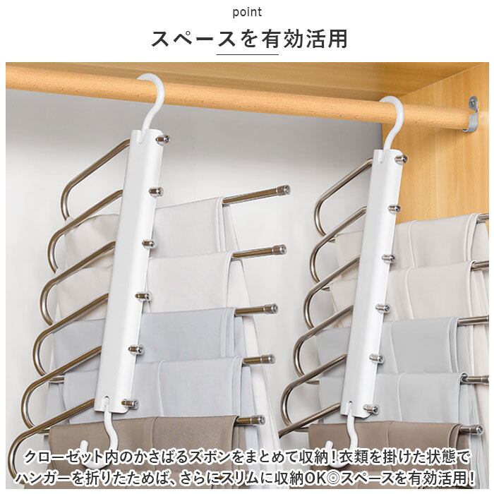 ・クローゼット内のかさばるズボンをまとめて収納!衣類を掛けた状態でハンガーを折りたためば、さらにスリムに収納OK◎スペースを有効活用!