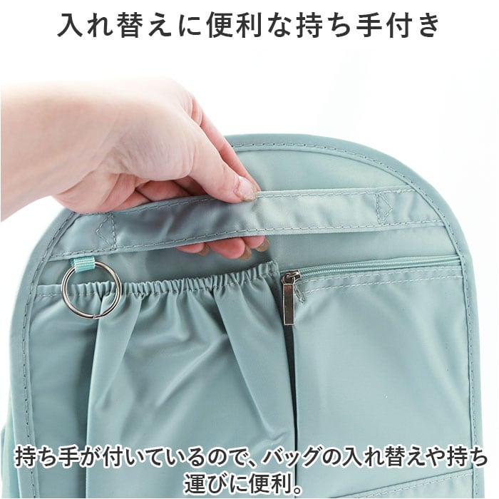 ・持ち手が付いているので、バッグの入れ替えや持ち運びに便利。