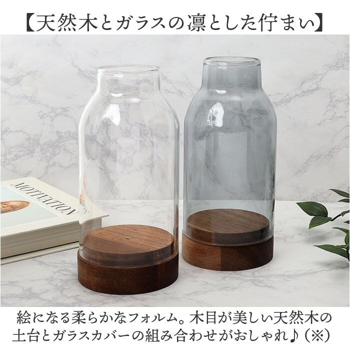 ・絵になる柔らかなフォルム。木目が美しい天然木の土台とガラスカバーの組み合わせがおしゃれ♪