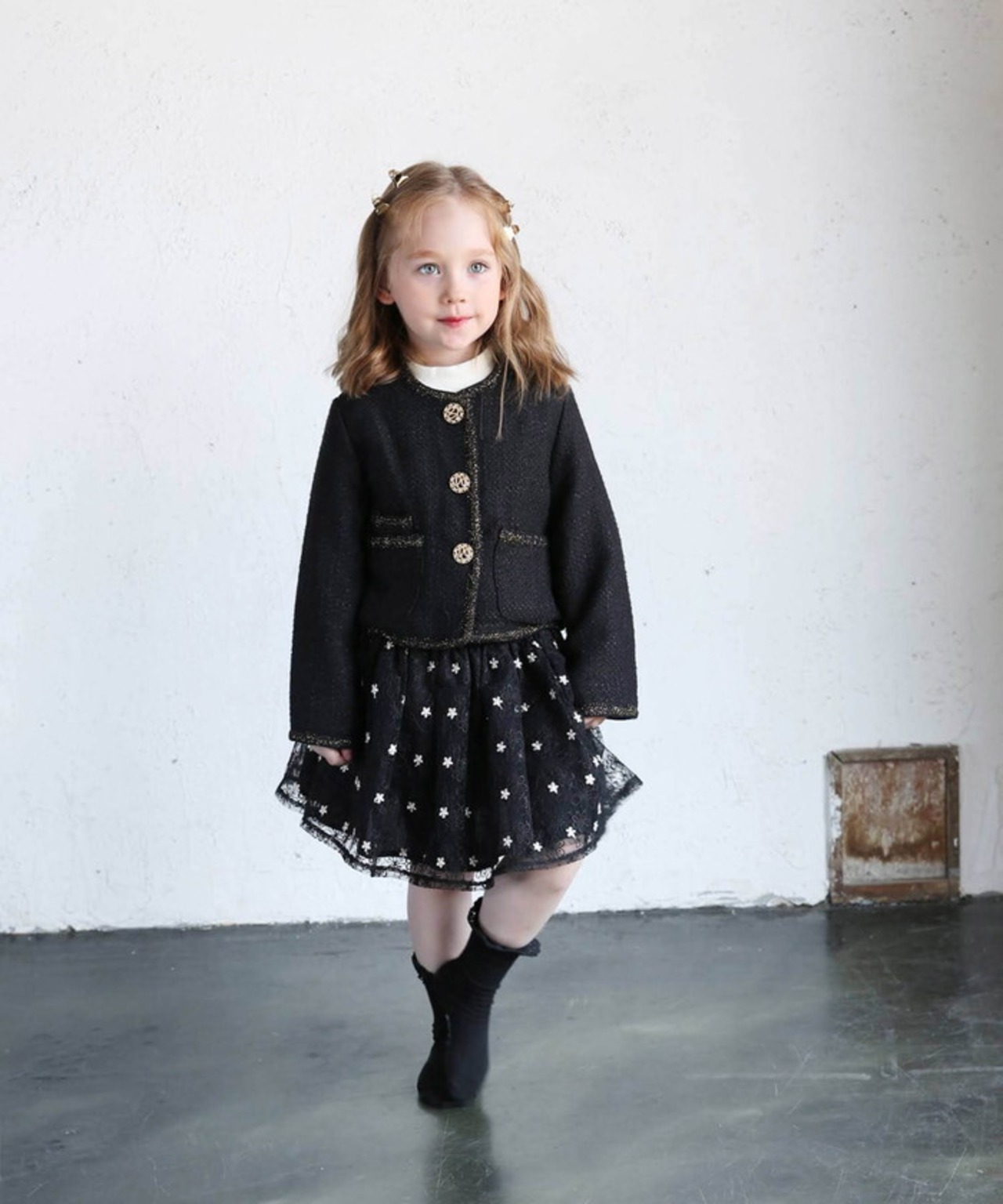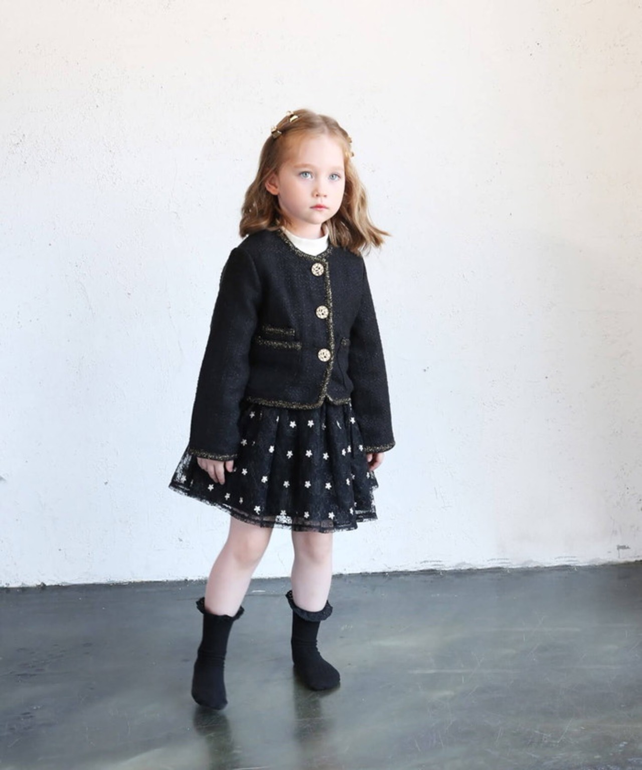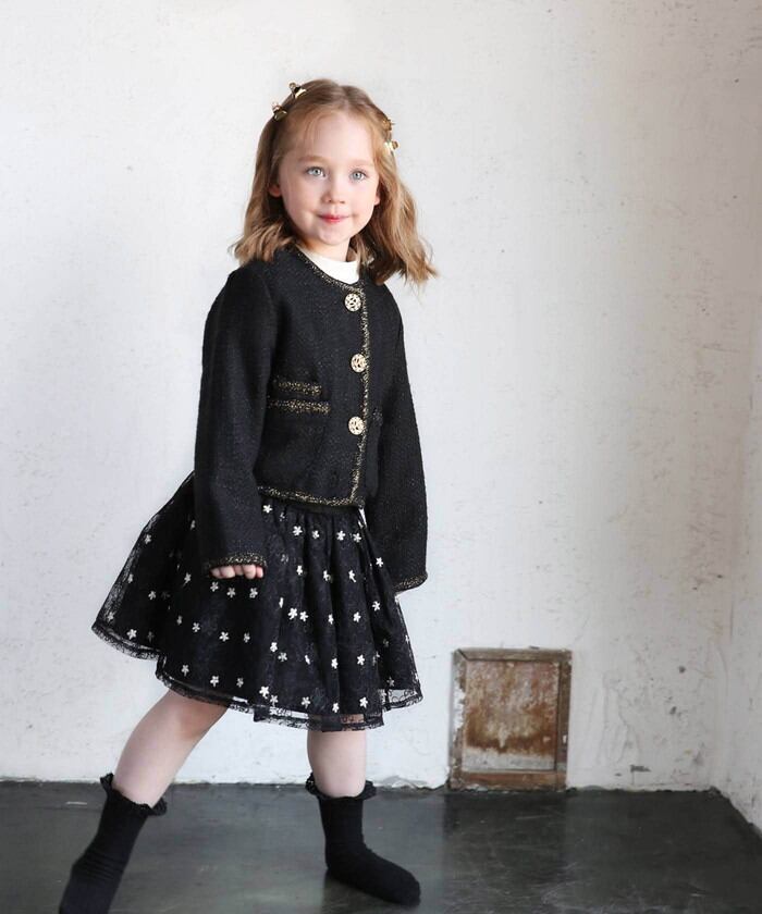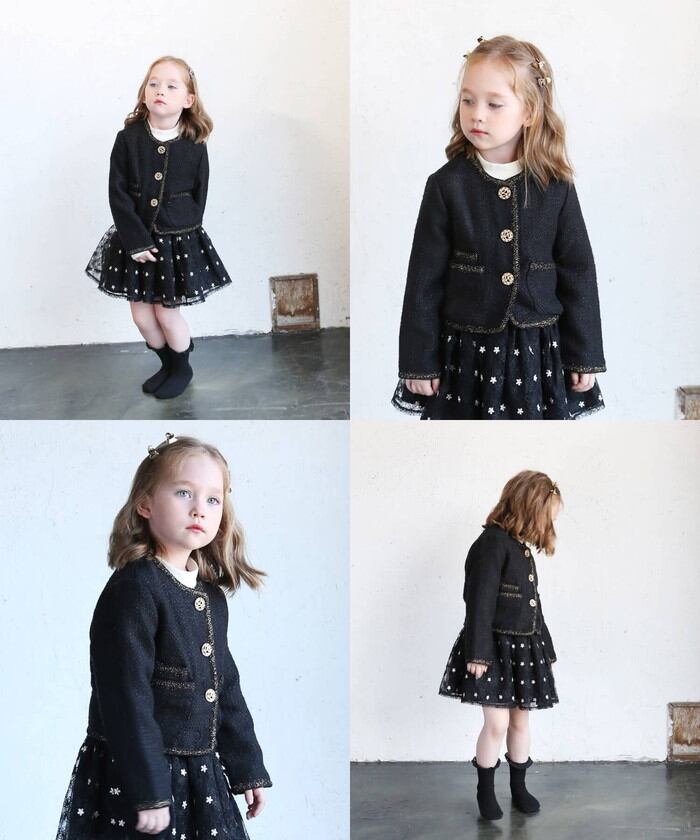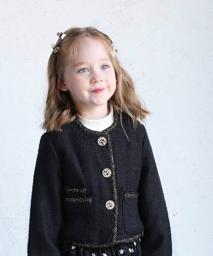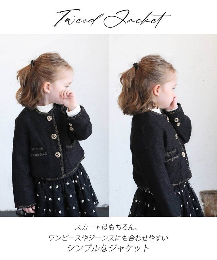 ・デイリーのシンプルさにフォーマルのエレガンスを加え、子供たちの自己表現を高めるツイードジャケット。