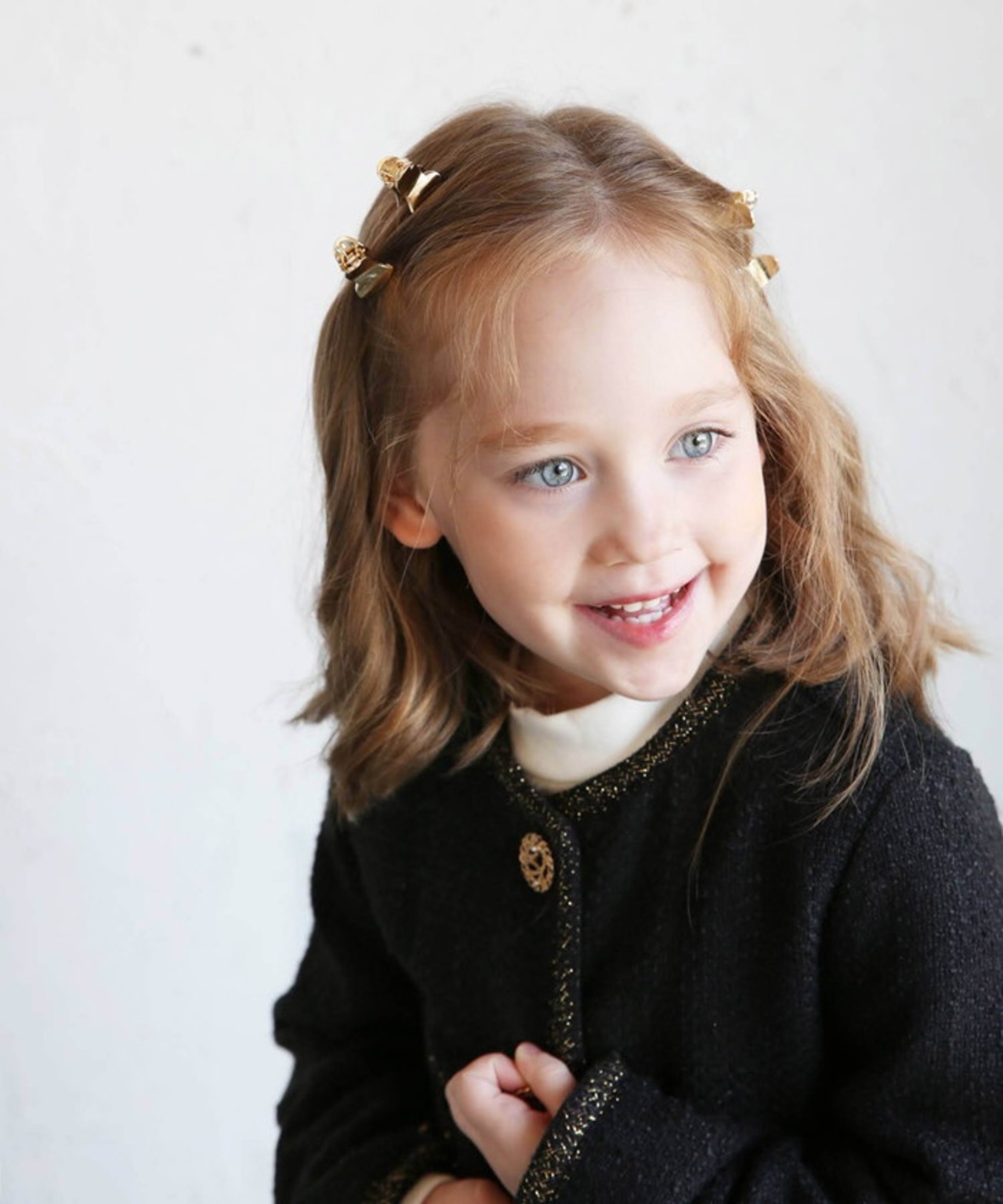 ・パール入りのゴールドボタンが、ジャケットにエレガントな要素を加えて、子供たちが大人顔負けのスタイルを楽しめるようにしています。