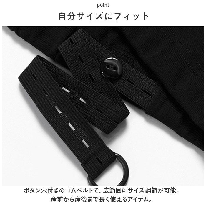・ボタン穴付きのゴムベルトで、広範囲にサイズ調節が可能。産前から産後まで長く使えるアイテム。