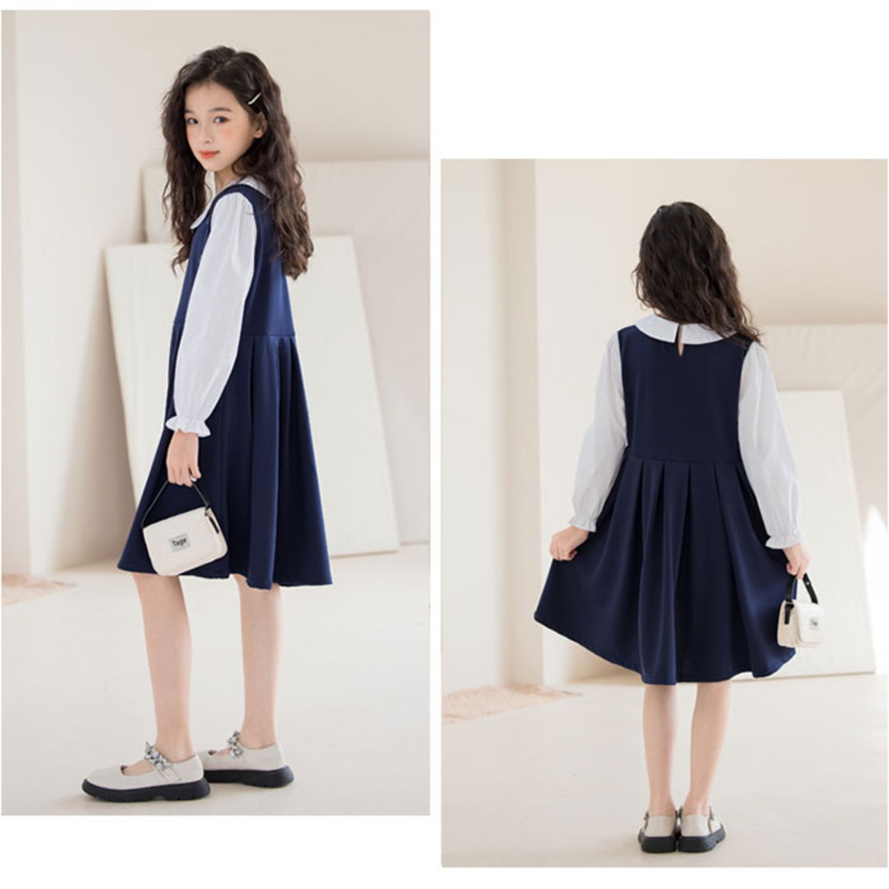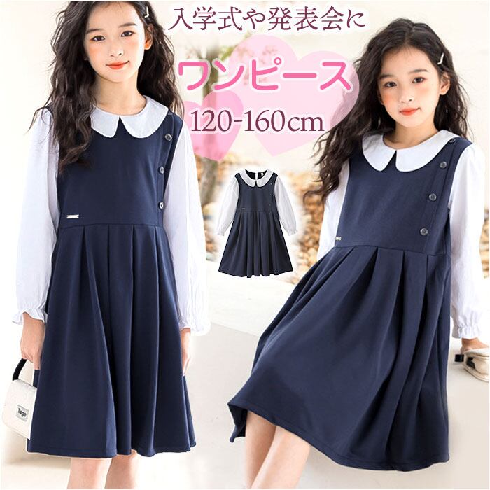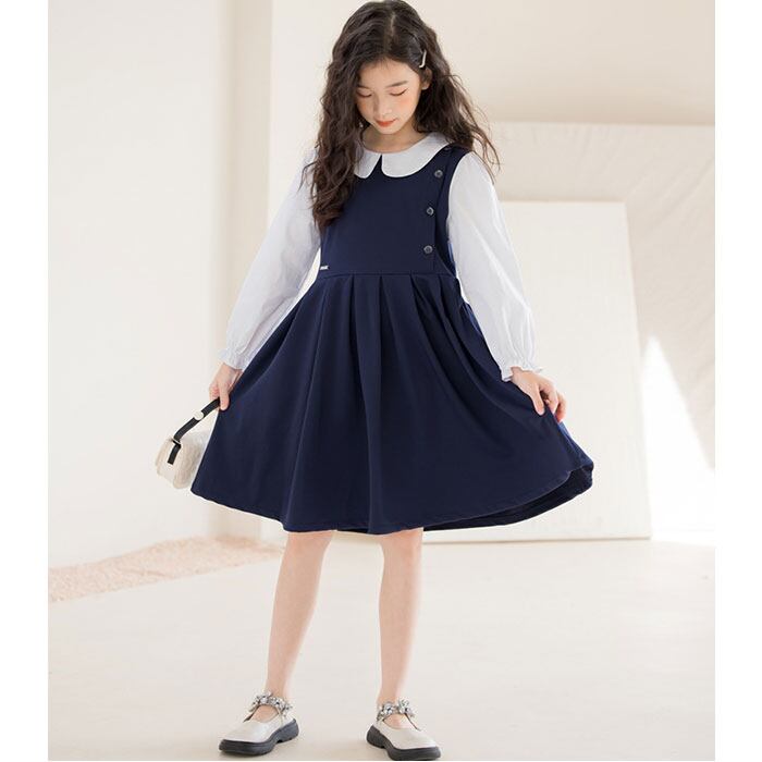 ・丸襟の白シャツをレイヤードしたようなネイビーのワンピース。縦ラインの飾りボタンとシルバーの金具がアクセントに。