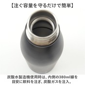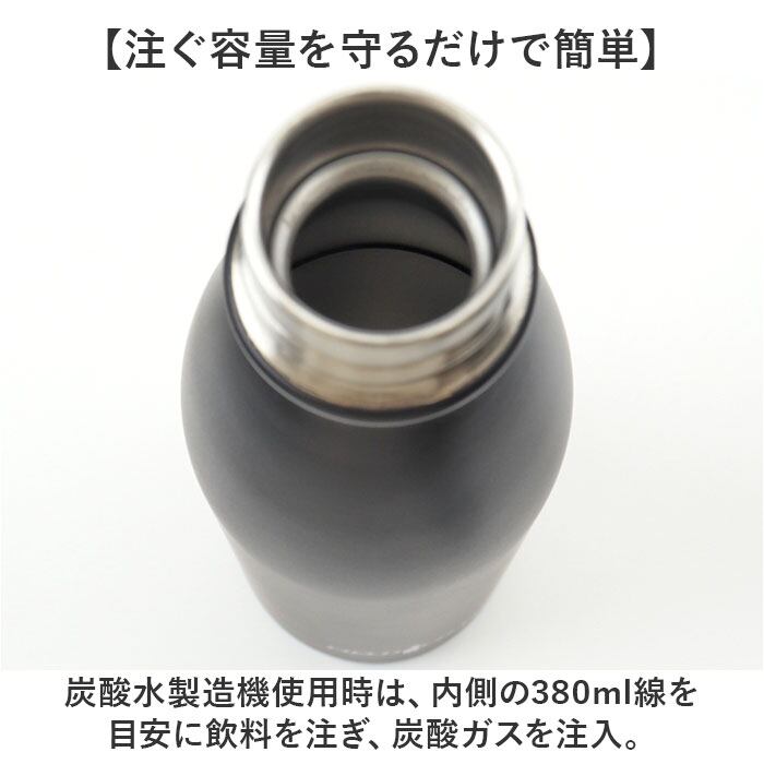 ・炭酸水製造機使用時は、内側の380ml線を目安に飲料を注ぎ、炭酸ガスを注入。