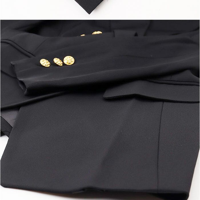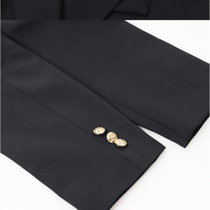 ・程よくメリハリのあるシルエット。ジャケットのゴールドボタンがアクセントに。