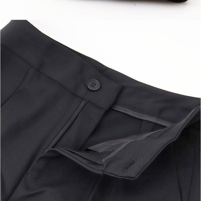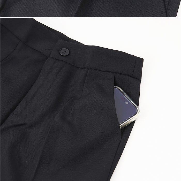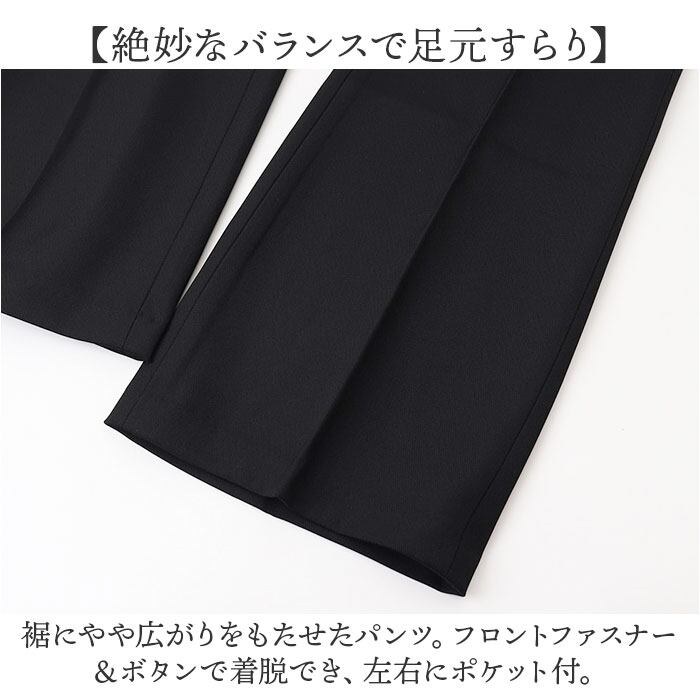 ・裾にやや広がりをもたせたパンツ。フロントファスナー&ボタンで着脱でき、左右にポケット付。