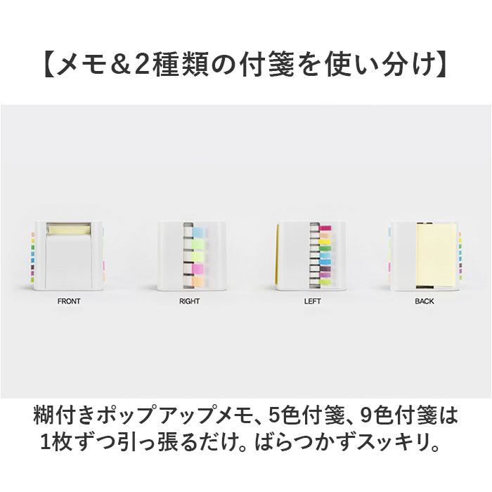 ・糊付きポップアップメモ、5色付箋、9色付箋は1枚ずつ引っ張るだけ。ばらつかずスッキリ。