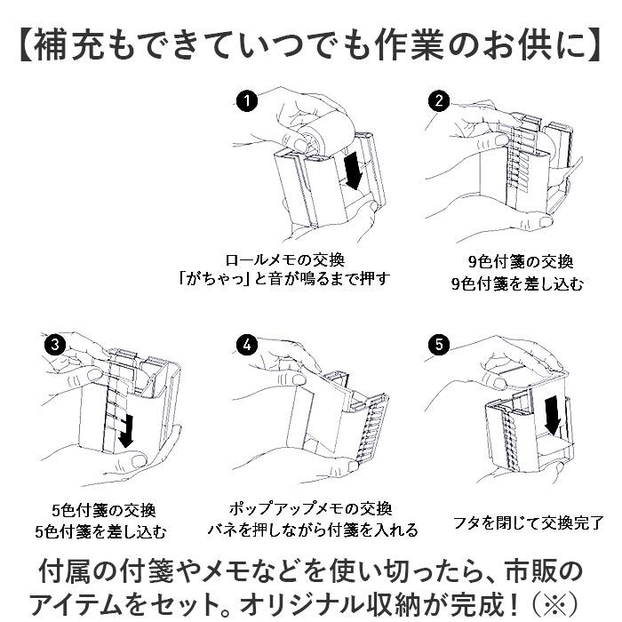 ・付属の付箋やメモなどを使い切ったら、市販のアイテムをセット。オリジナル収納が完成!