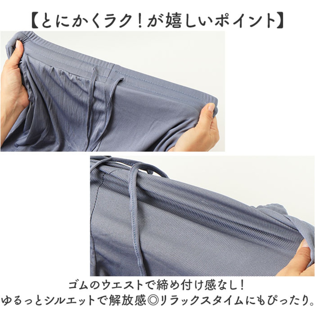 ・ゴムのウエストで締め付け感なし!ゆるっとシルエットで解放感◎リラックスタイムにもぴったり