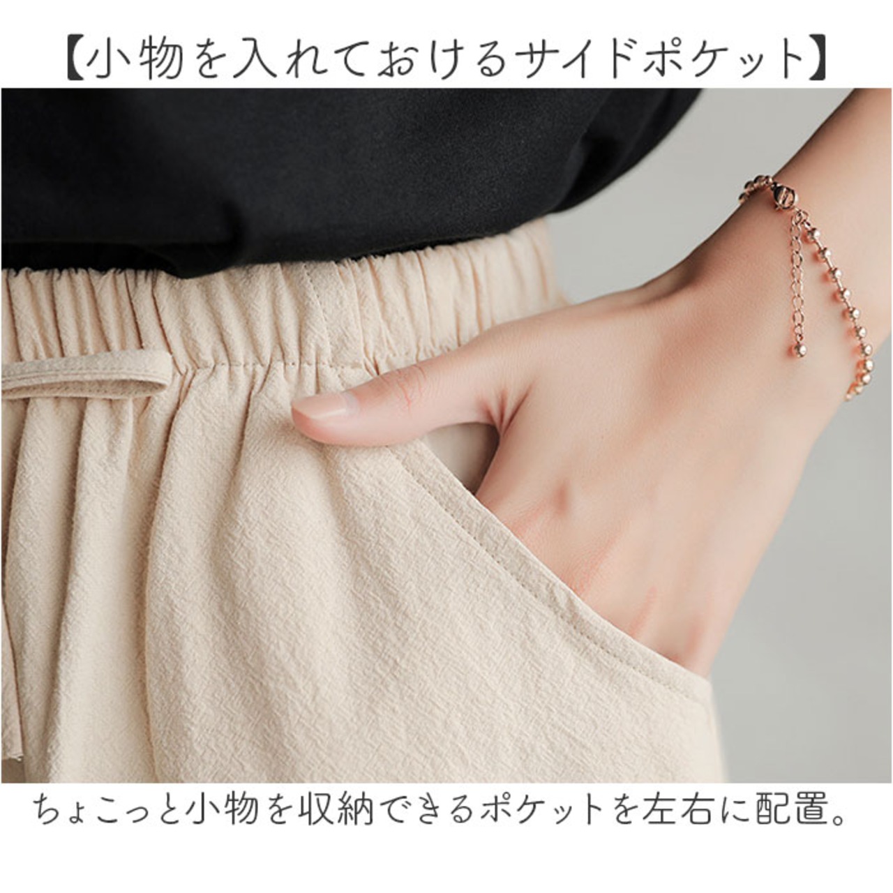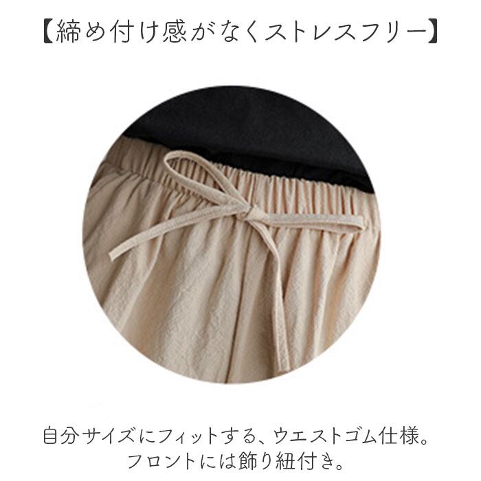 ・自分サイズにフィットする、ウエストゴム仕様。フロントには飾り紐付き。