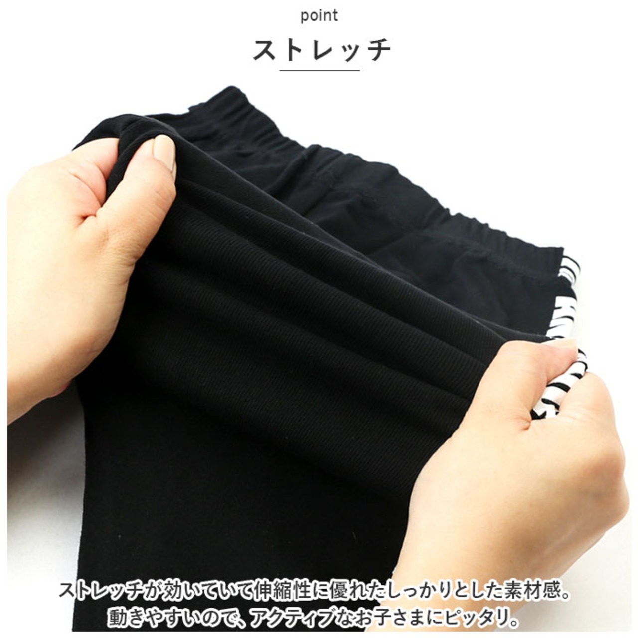 ・ストレッチが効いていて伸縮性に優れたしっかりとした素材感。動きやすいので、アクティブなお子さまにピッタリ。
