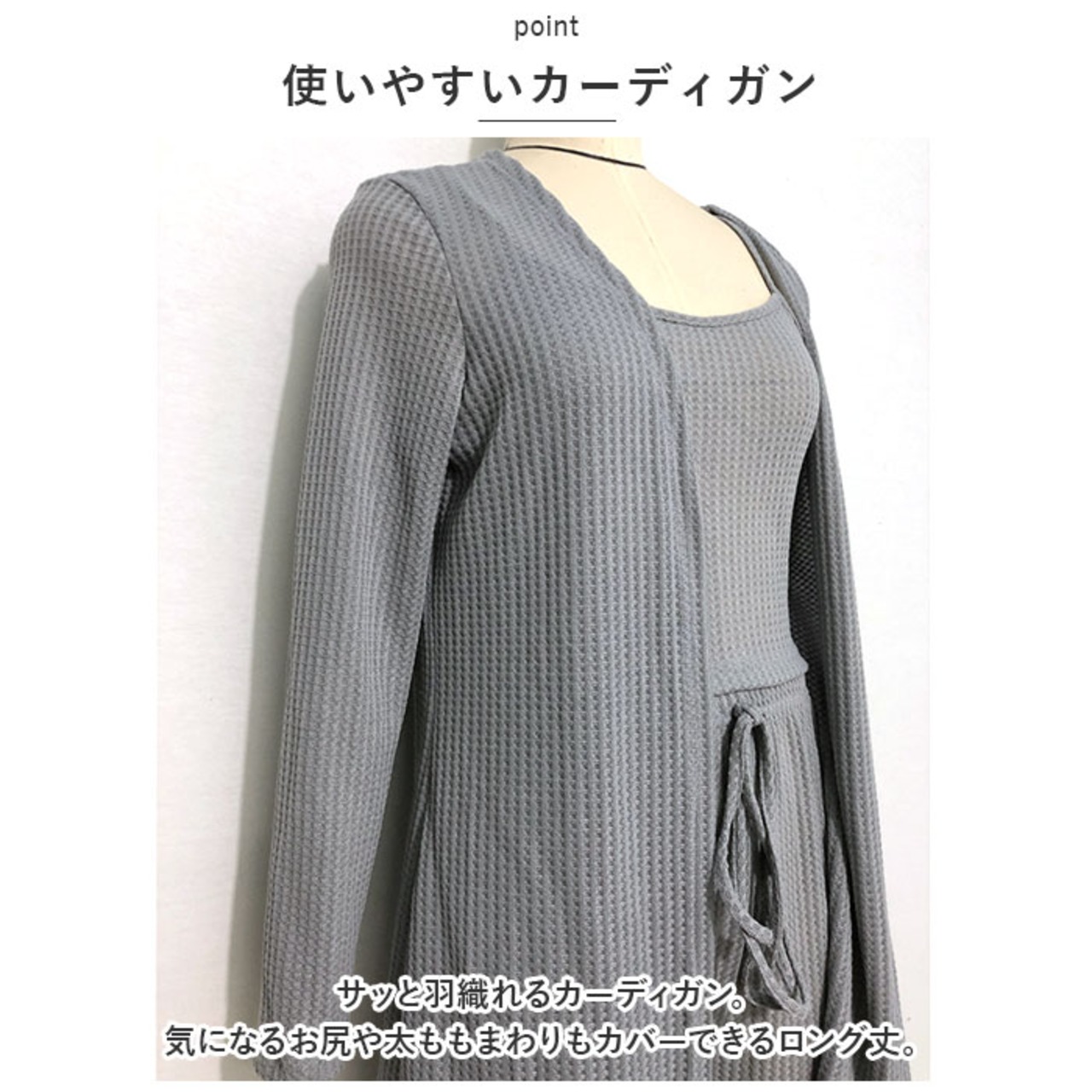 ・サッと羽織れるカーディガン。気になるお尻や太ももまわりもカバーできるロング丈。