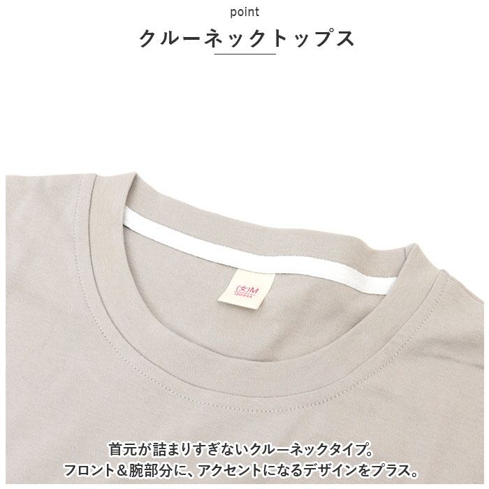 ・首元が詰まりすぎないクルーネックタイプ。フロント&腕部分に、アクセントになるデザインをプラス。