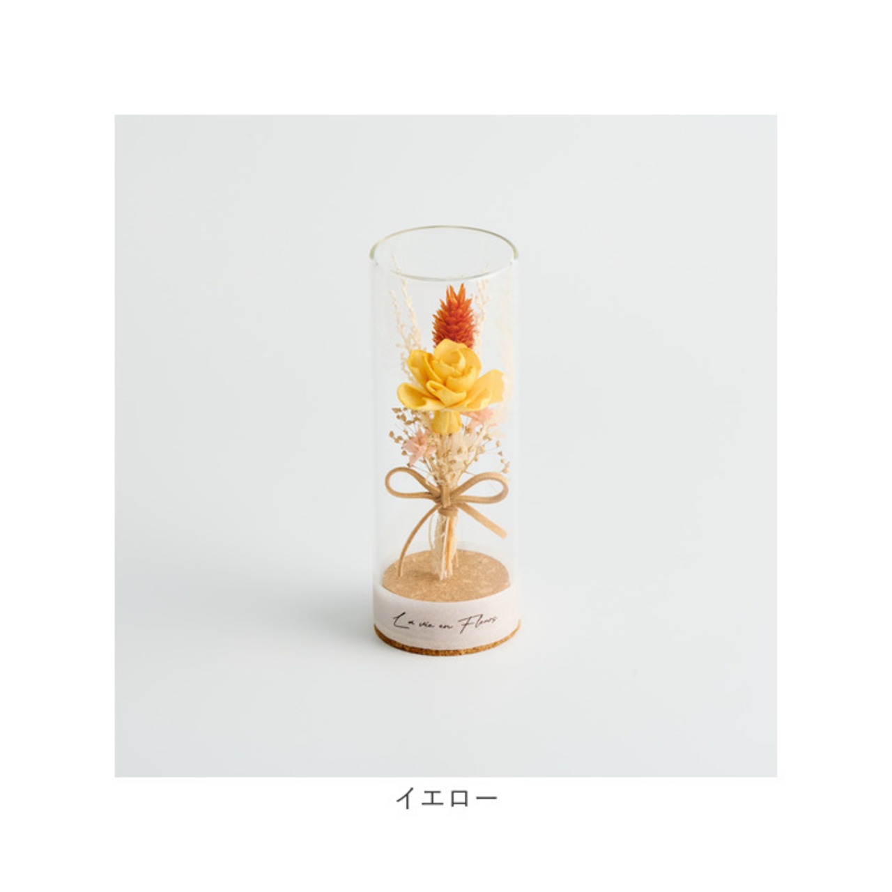 ・細身のガラスドーム内に、ソラフラワーのアレンジメントを。コルクとの相性も抜群。