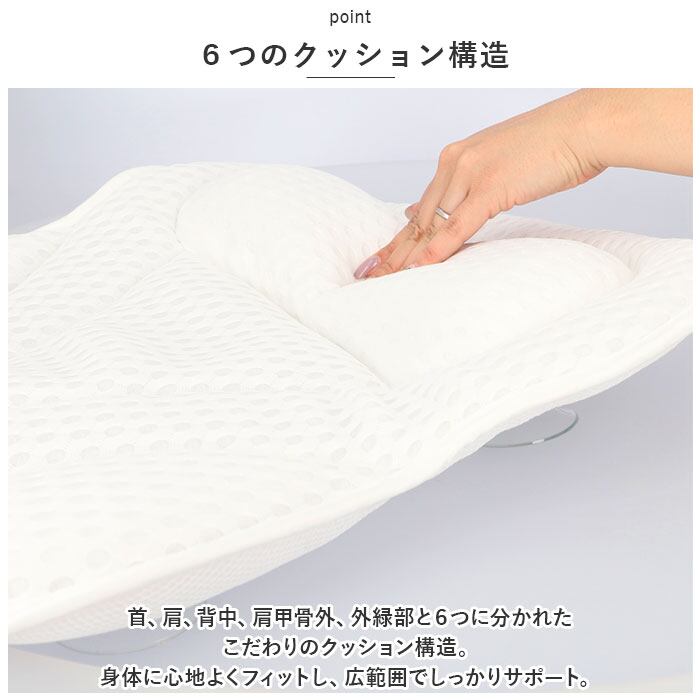 ・首、肩、背中、肩甲骨外、外緑部と6つに分かれたこだわりのクッション構造。身体に心地よくフィットし、広範囲でしっかりサポート。