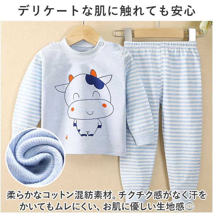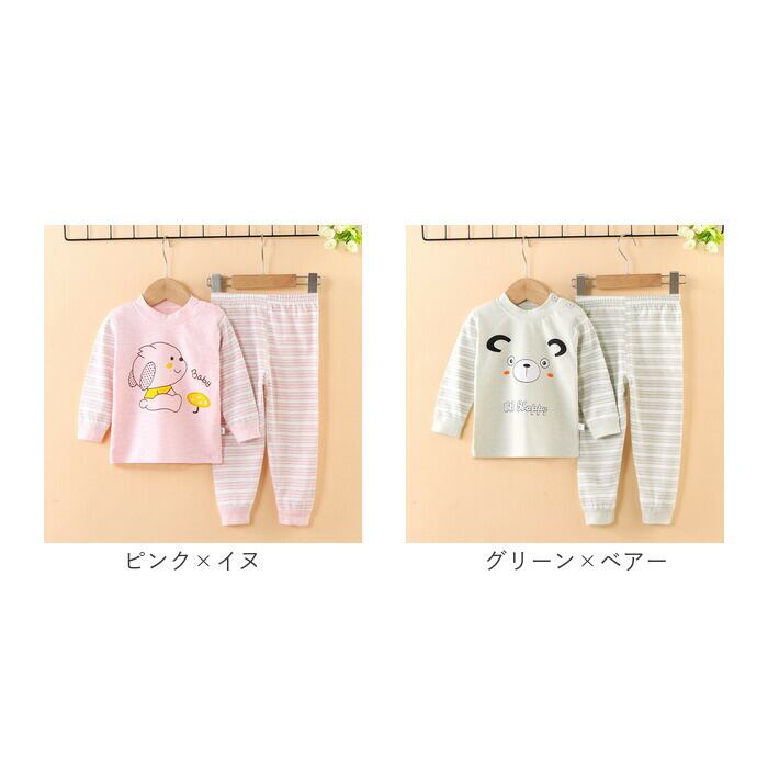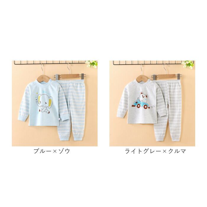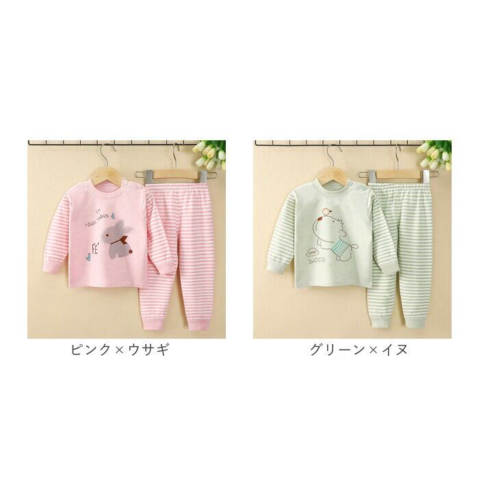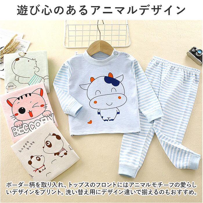 ・ボーダー柄を取り入れ、トップスのフロントにはアニマルモチーフの愛らしいデザインをプリント。洗い替え用にデザイン違いで揃えるのもおすすめ。