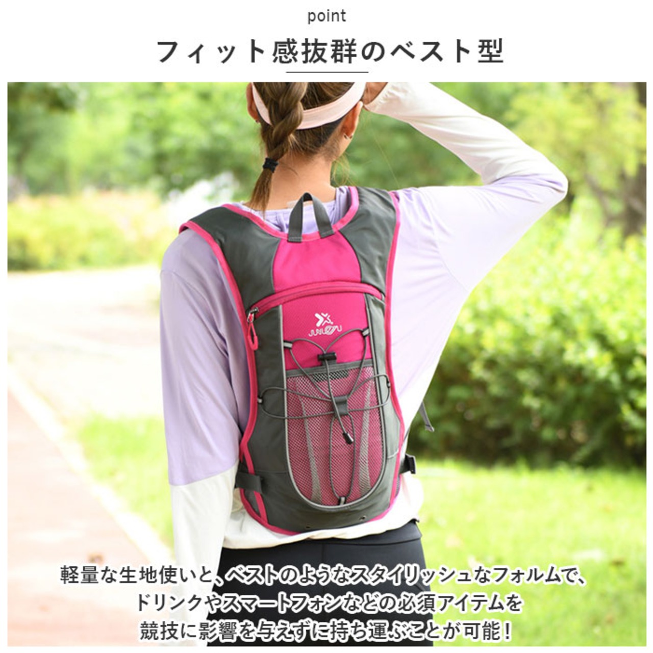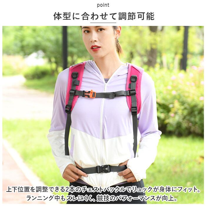 ・上下位置を調整できる2本のチェストバックルでリュックが身体にフィット。ランニング中もズレにくく、競技のパフォーマンスが向上。