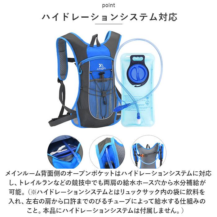 ・メインルーム背面側のオープンポケットはハイドレーションシステムに対応し、トレイルランなどの競技中でも両肩の給水ホース穴から水分補給が可能。(※ハイドレーションシステムとはリュックサック内の袋に飲料を入れ、左右の肩から口許までのびるチューブによって給水する仕組みのこと。本品にハイドレーションシステムは付属しません。)