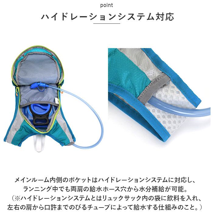 ・メインルーム内側のポケットはハイドレーションシステムに対応し、ランニング中でも両肩の給水ホース穴から水分補給が可能。(※ハイドレーションシステムとはリュックサック内の袋に飲料を入れ、左右の肩から口許までのびるチューブによって給水する仕組みのこと。)