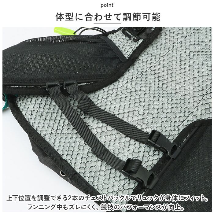 ・上下位置を調整できる2本のチェストバックルでリュックが身体にフィット。ランニング中もズレにくく、競技のパフォーマンスが向上。