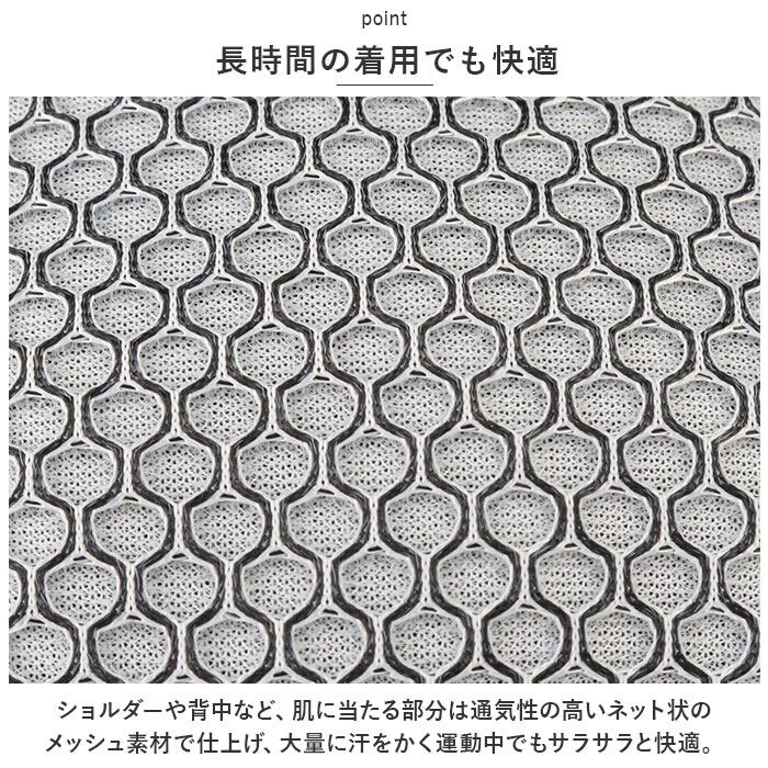 ・ショルダーや背中など、肌に当たる部分は通気性の高いネット状のメッシュ素材で仕上げ、大量に汗をかく運動中でもサラサラと快適。