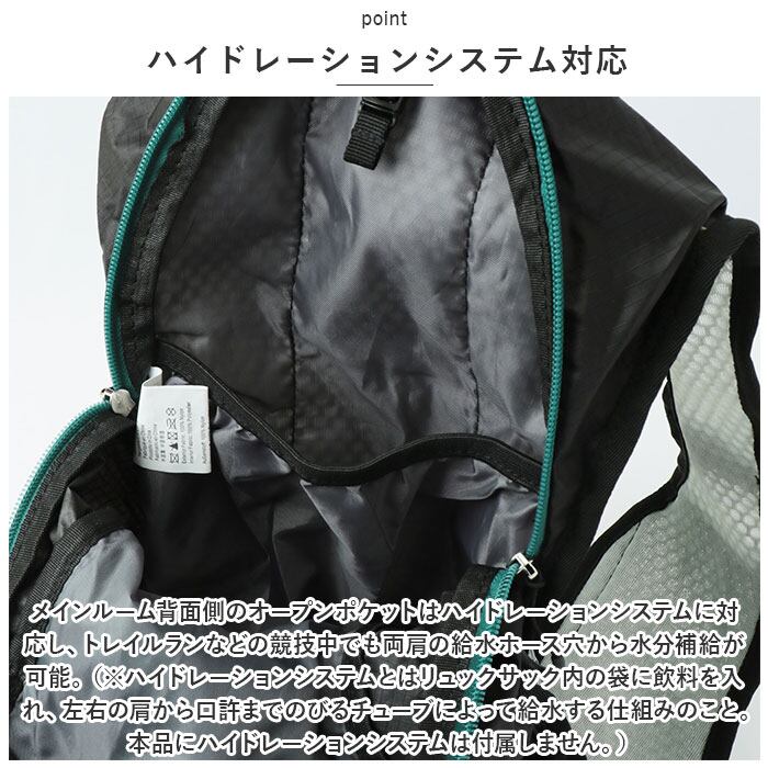 ・メインルーム背面側のオープンポケットはハイドレーションシステムに対応し、トレイルランなどの競技中でも両肩の給水ホース穴から水分補給が可能。(※ハイドレーションシステムとはリュックサック内の袋に飲料を入れ、左右の肩から口許までのびるチューブによって給水する仕組みのこと。本品にハイドレーションシステムは付属しません。)