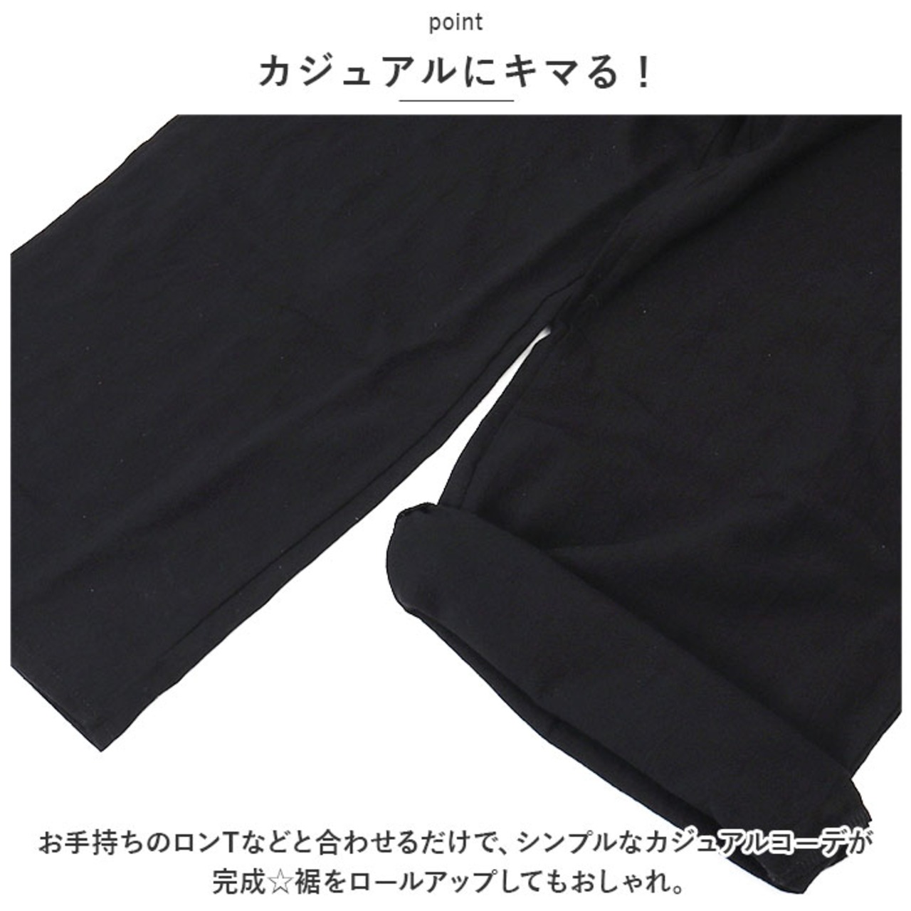 ・お手持ちのロンTなどと合わせるだけで、シンプルなカジュアルコーデが完成☆裾をロールアップしてもおしゃれ。