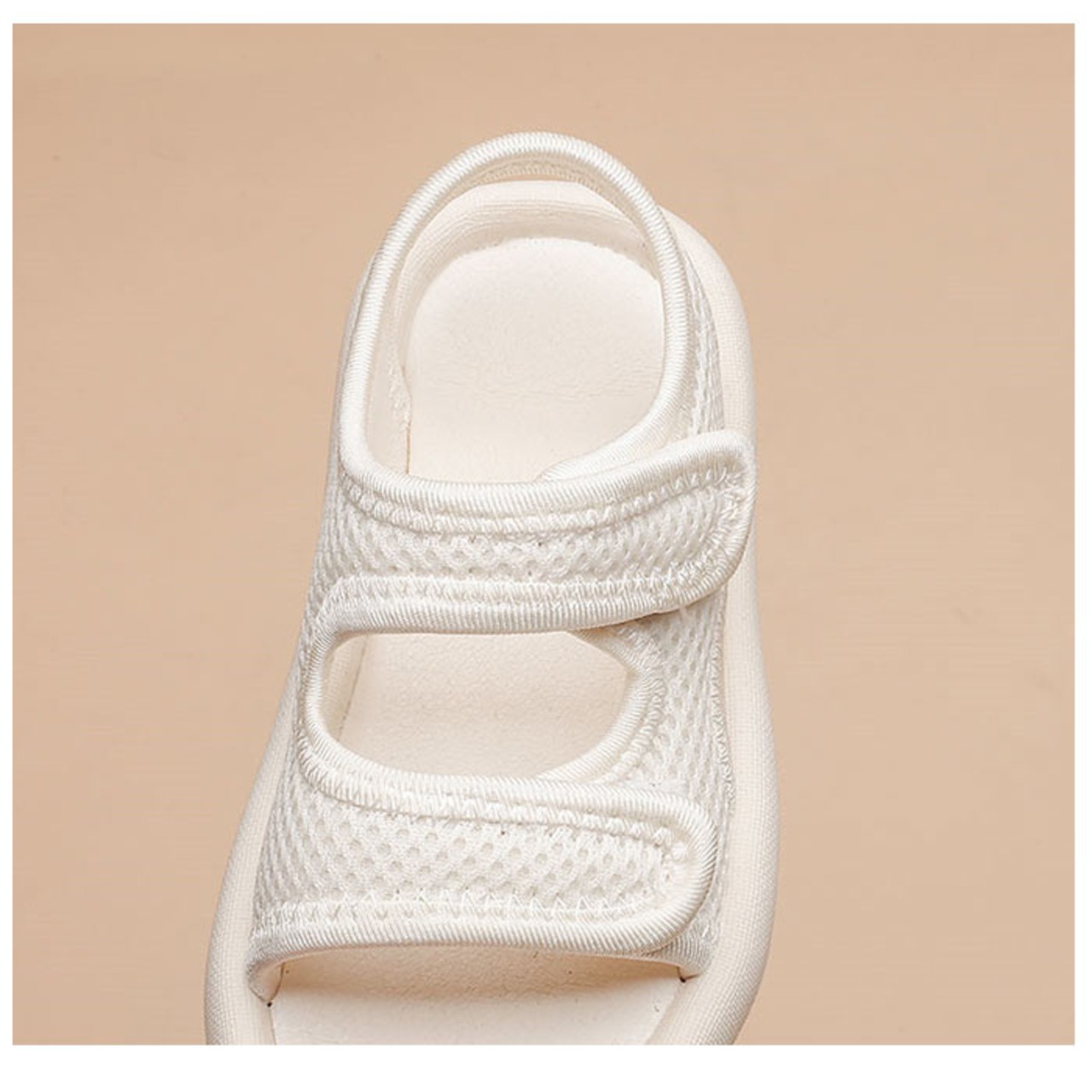・足指を広げてしっかり踏ん張れるよう、つま先部分は広めの設計。面ファスナーで足首も固定でき歩きやすいこだわりの設計。