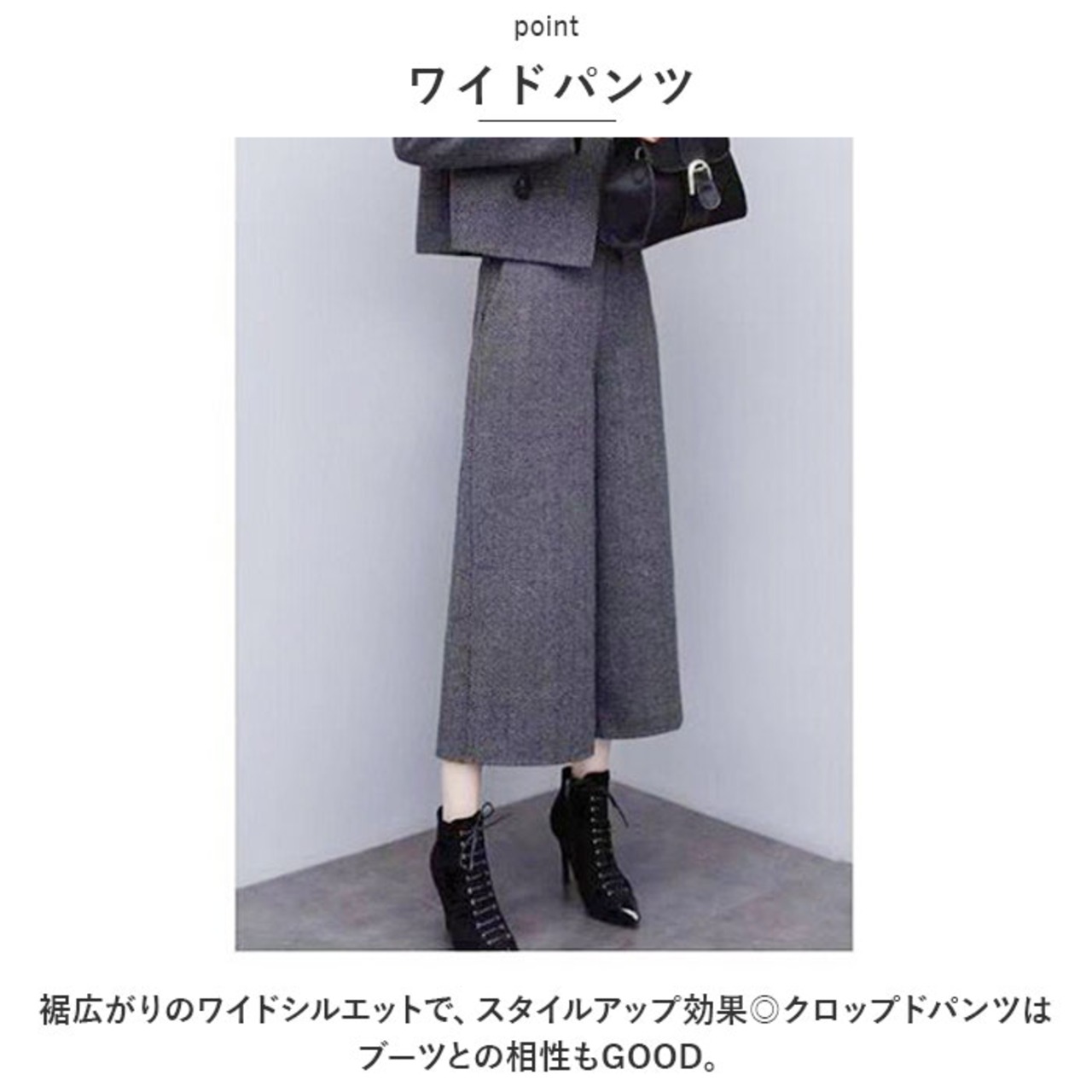 ・裾広がりのワイドシルエットで、スタイルアップ効果◎クロップドパンツはブーツとの相性もGOOD。