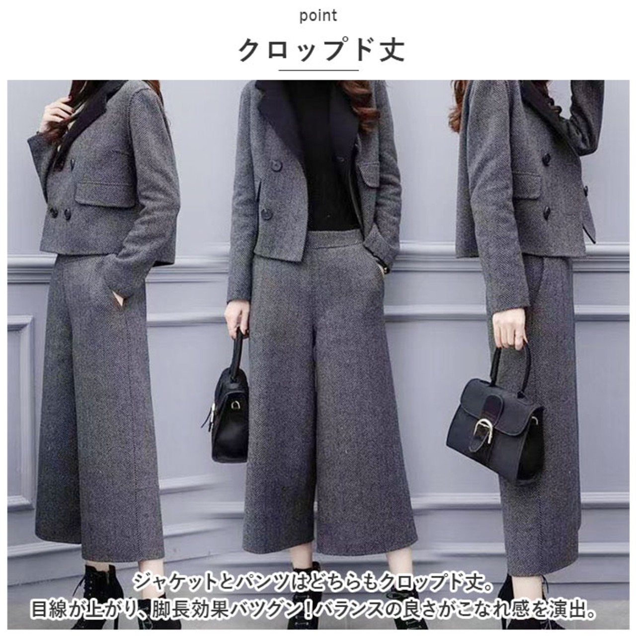 ・ジャケットとパンツはどちらもクロップド丈。目線が上がり、脚長効果バツグン!バランスの良さがこなれ感を演出。