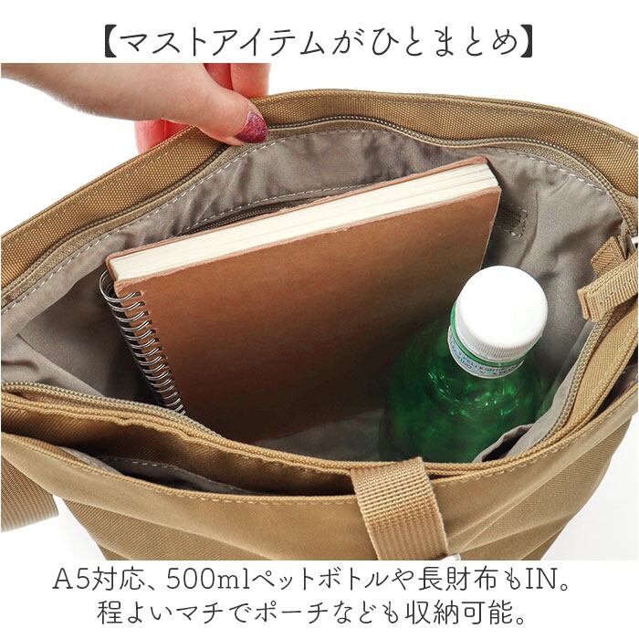 ・A5対応、500mlペットボトルや長財布もIN。程よいマチでポーチなども収納可能。