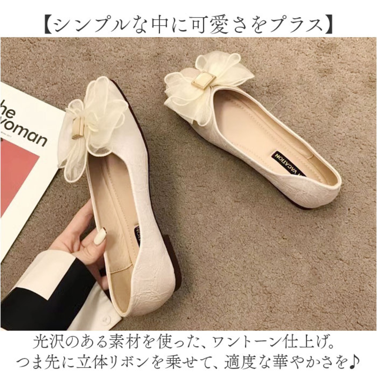 ・光沢のある素材を使った、ワントーン仕上げ。つま先に立体リボンを乗せて、適度な華やかさを♪