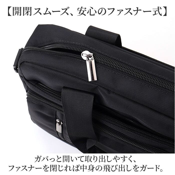・ガバっと開いて取り出しやすく、ファスナーを閉じれば中身の飛び出しをガード。