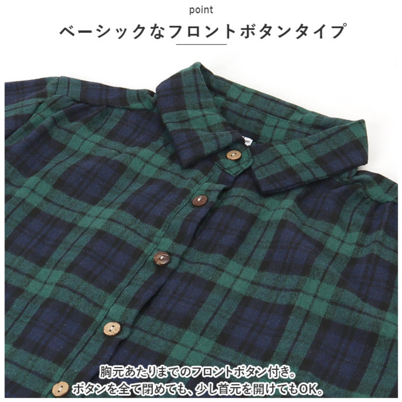・胸元あたりまでのフロントボタン付き。ボタンを全て閉めても、少し首元を開けてもOK。