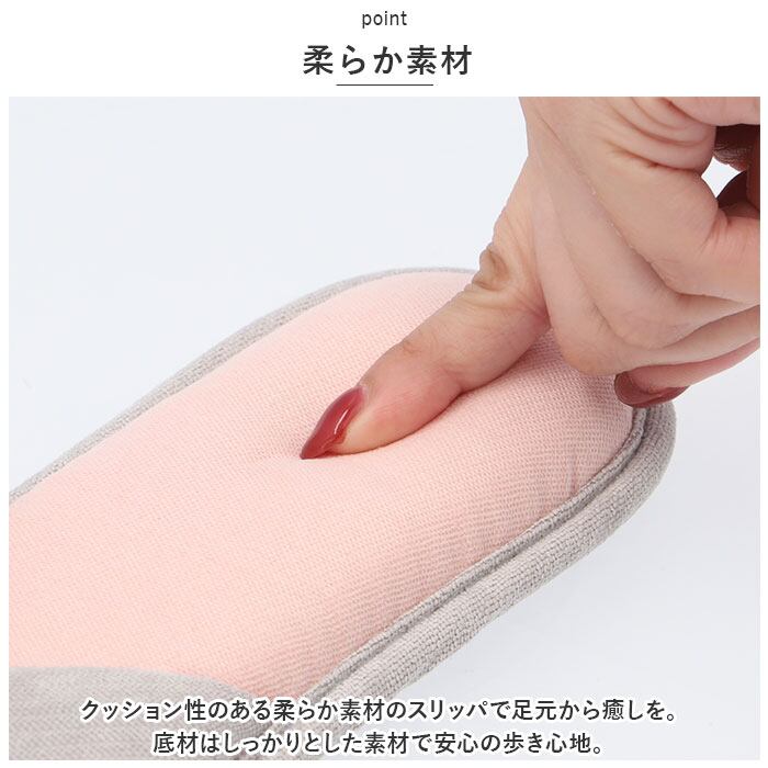 ・クッション性のある柔らか素材のスリッパで足元から癒しを。底材はしっかりとした素材で安心の歩き心地。