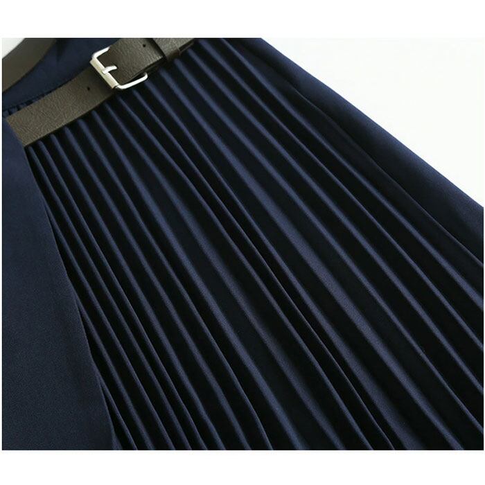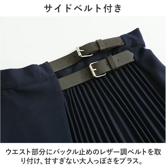 ・ウエスト部分にバックル止めのレザー調ベルトを取り付け、甘すぎない大人っぽさをプラス。